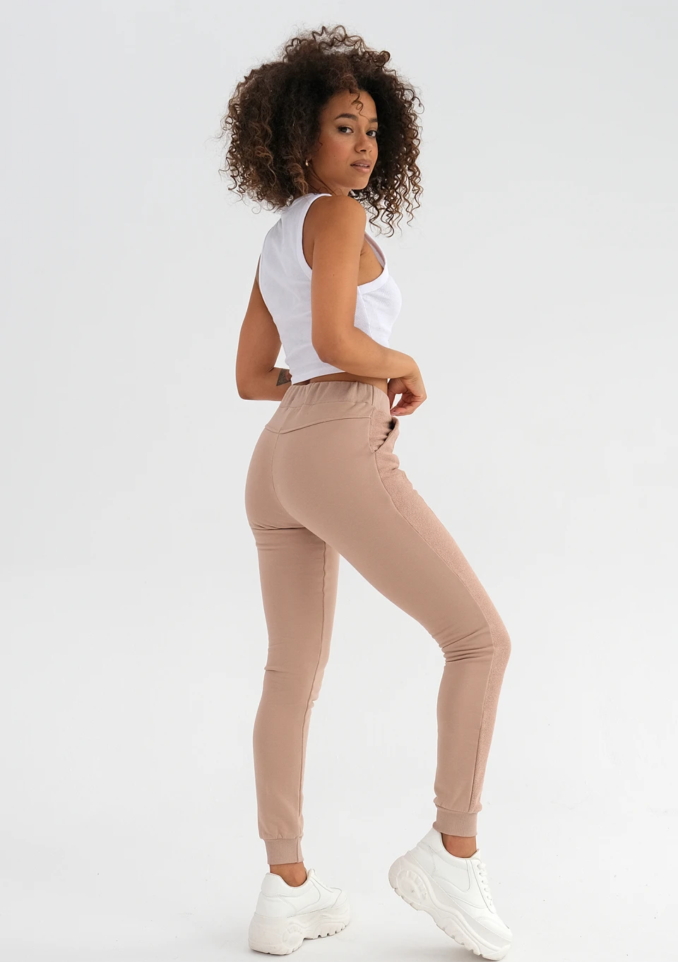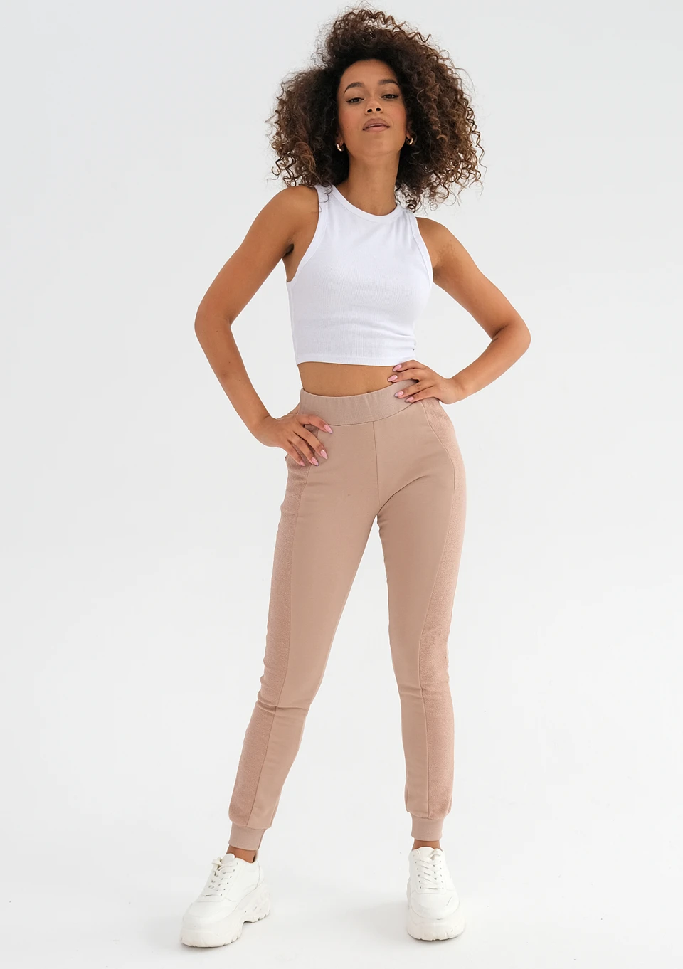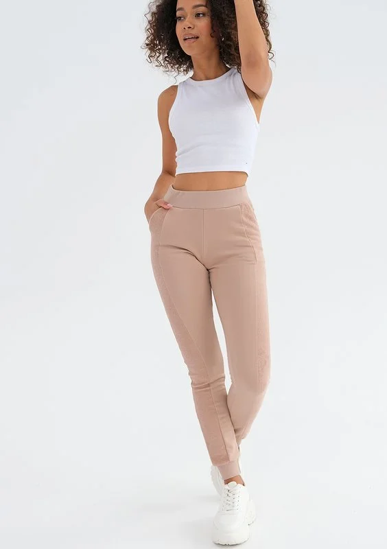 Dzięki tym beżowym spodniom zapewnisz sobie komfort w sportowym stylu, a przy okazji podkreślisz swoje kobiece linie. Piękny fason odmieniają boczne wstawki materiału po lewej stronie.