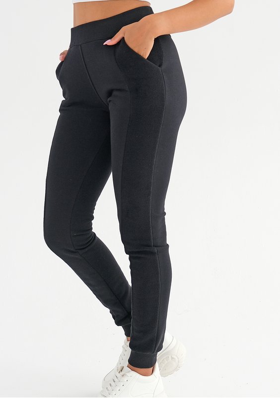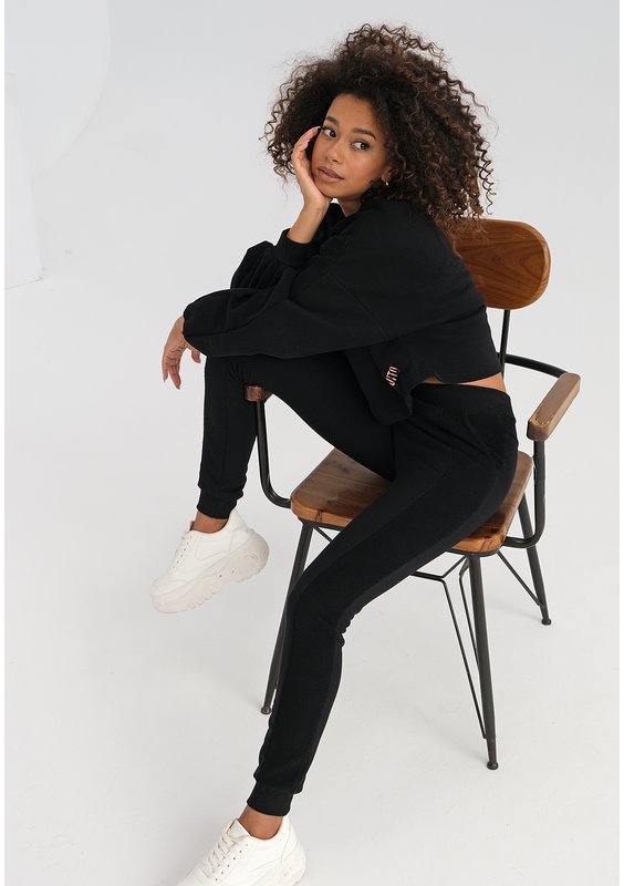 Czarne spodnie dresowe świetnie akcentują walory sylwetki, są komfortowe w noszeniu i pasują do każdej kombinacji! Miej je w swojej szafie, a nie zabraknie Ci stylizacyjnej bazy na codzienne wyjścia. Minimalistyczny, sportowy model urozmaicają boczne wstawki odwrotnej strony dzianiny.