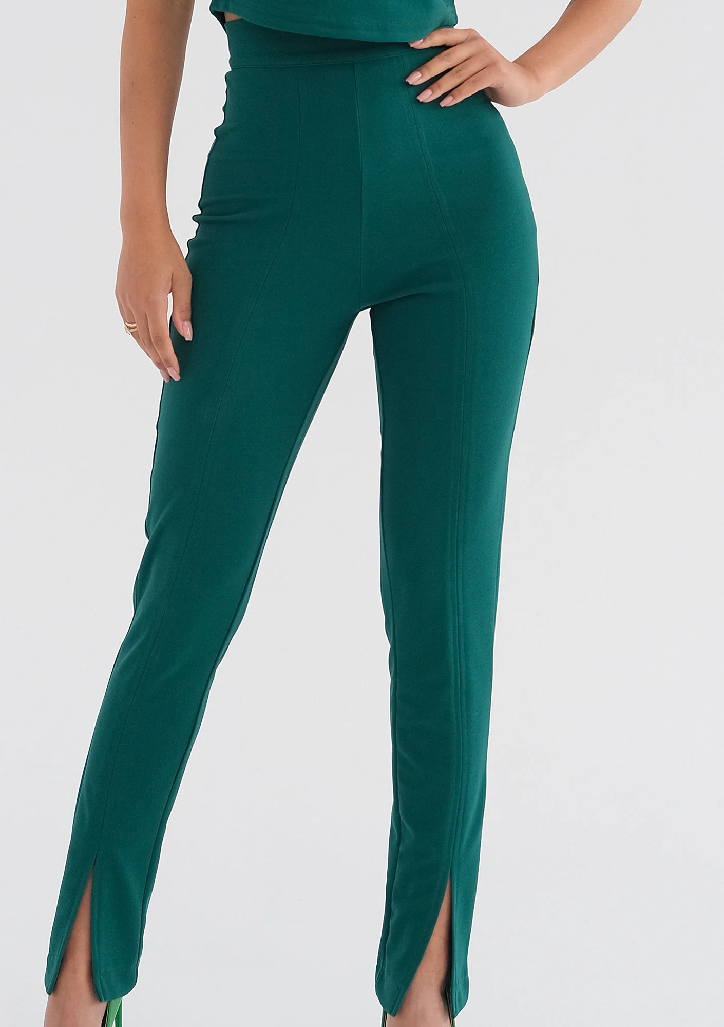 Każda kobieta pragnie być zauważona i od czasu do czasu się wyróżnić. Przygotowaliśmy dla Ciebie intensywne i barwne stylizacje, które dodadzą ciekawego akcentu. Zielone spodnie cygaretki przełamują wszelką rutynę i obalają schematy – dzięki szykownemu krojowi możesz zabłysnąć wyjątkową kolorystyką przy oficjalnych okazjach i w pracy.