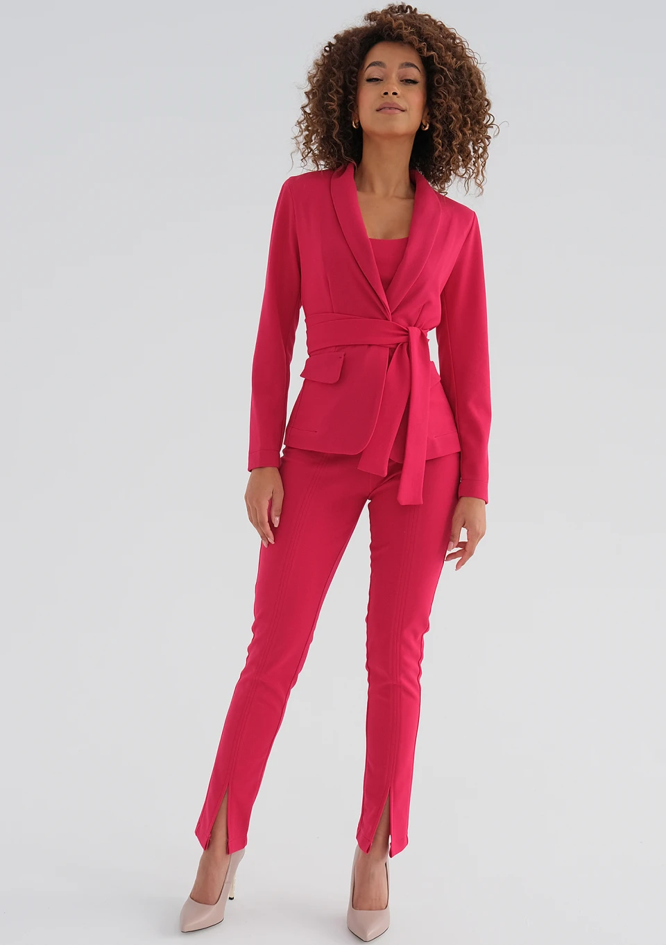 Piękne spodnie damskie w zmysłowym różu amarant, z wysokim stanem i rozcięciami. Model zapinany drobnym zamkiem, zmysłowo podkreślający linie sylwetki.