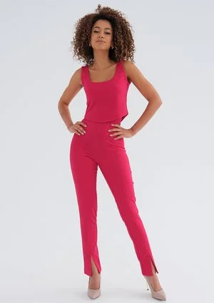 Różowe spodnie damskie o kroju cygaretek wykorzystasz w niejednym sezonie. Dopasowany fason z modnymi rozcięciami na nogawkach wpisuje się w stały kanon trendów. To spodnie z wysokim stanem, który wygładzi linię bioder, zarysuje kształt pupy i estetycznie zatuszuje wypukłości wokół brzucha. Model dopasuje się do Twojej figury i komfortowo ułoży, z boku posiada drobny zamek. Wybierając top Zaya i marynarkę o fasonie Goma skomponujesz piękny total look, który prezentuje na sobie nasza modelka Jackie. Taki outfit pasuje na codzienne spotkania zawodowe, randkę i drobne uroczystości.