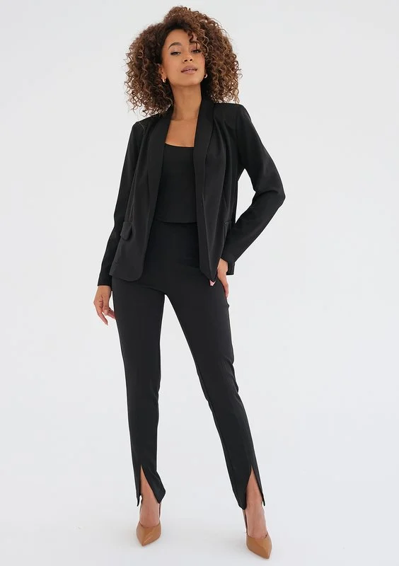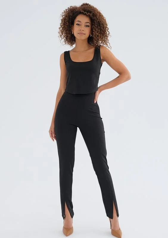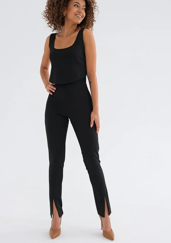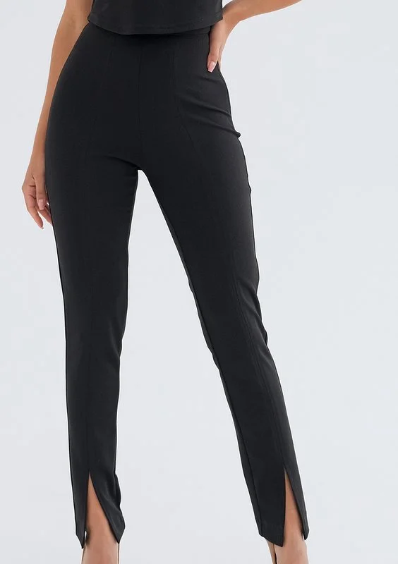 Eleganckie spodnie damskie w klasycznej czerni. Model z wysokim stanem i ciekawym efektem rozciętych na dole nogawek. Zmysłowo podkreślą każdy walor Twojej sylwetki.