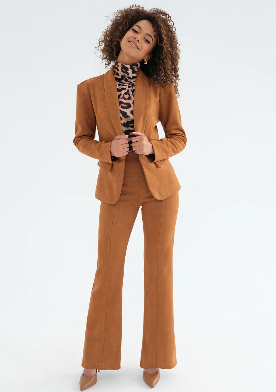 Brązowe spodnie damskie w odcieniu karmelu z modnej imitacji zamszu. Fason z wysokim stanem i poszerzaną nogawką zmysłowo podkreśla sylwetkę.