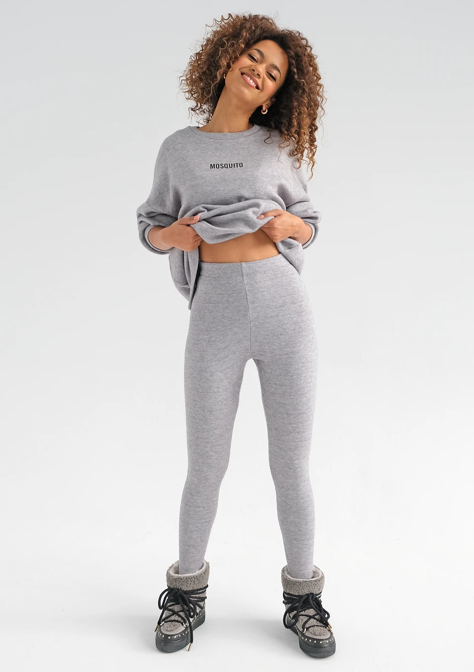 Dzianinowe legginsy damskie w spokojnym tonie szarości. Wykonane z miękkiej dzianiny, w sam raz na chłodne dni, w których szczególnie będziesz potrzebować wygodnej stylizacji.