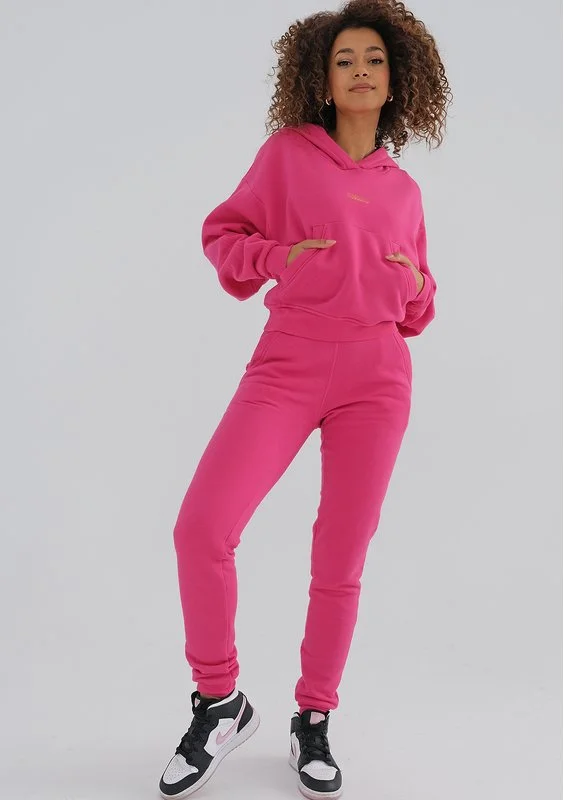Spodnie dresowe z miękkiej dzianiny w intensywnym różu fuksja. Delikatnie podkreślają sylwetkę, a przy tym zapewniają pełen komfort.