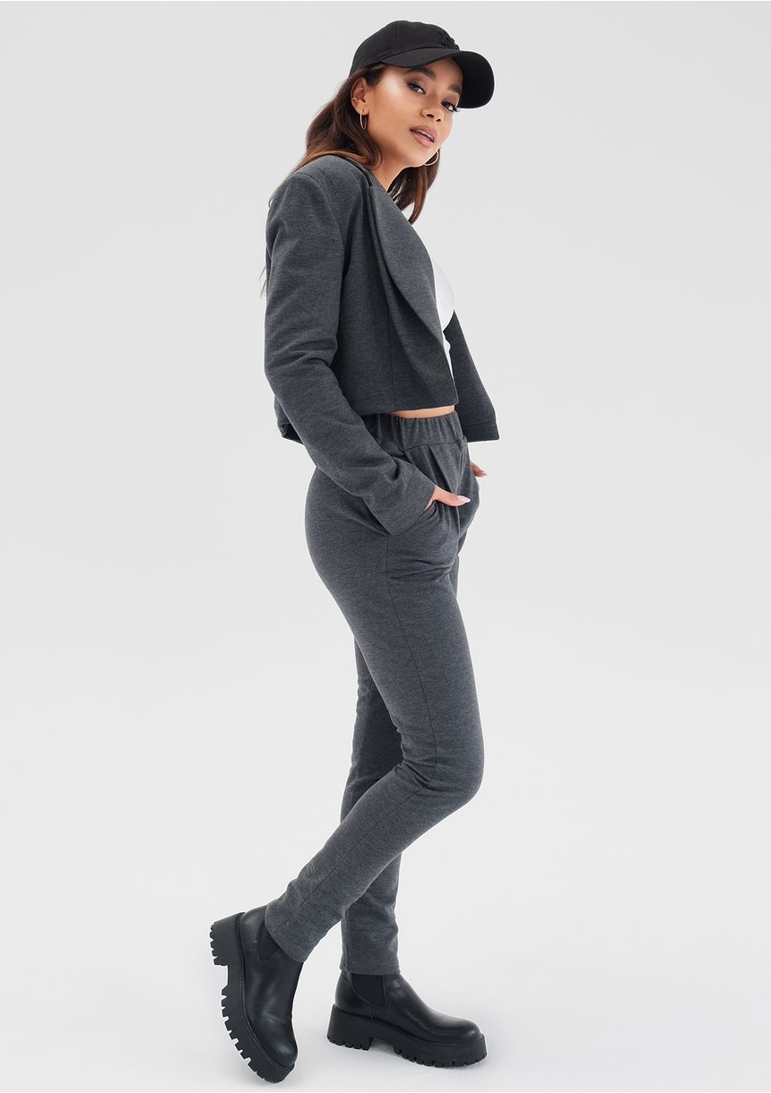 Wygodne spodnie w melanżowym graficie, w całości uszyte z bawełny w polskiej szwalni. Idealnie pasują do krótkiej marynarki Rachel.