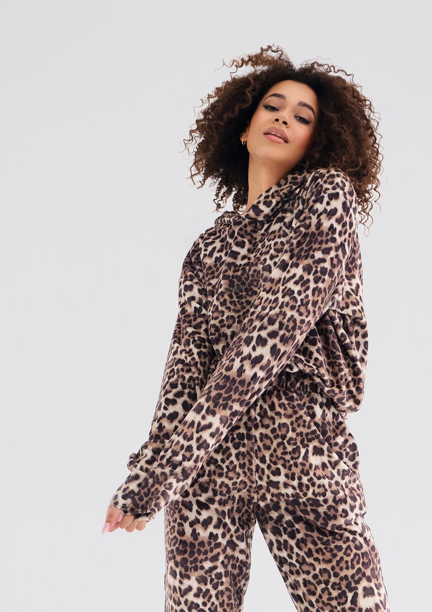 Brązowe spodnie dresowe wykonane w polskiej szwalni z aksamitnej dzianiny velvet. Model ze stylowym wzorem cętek.