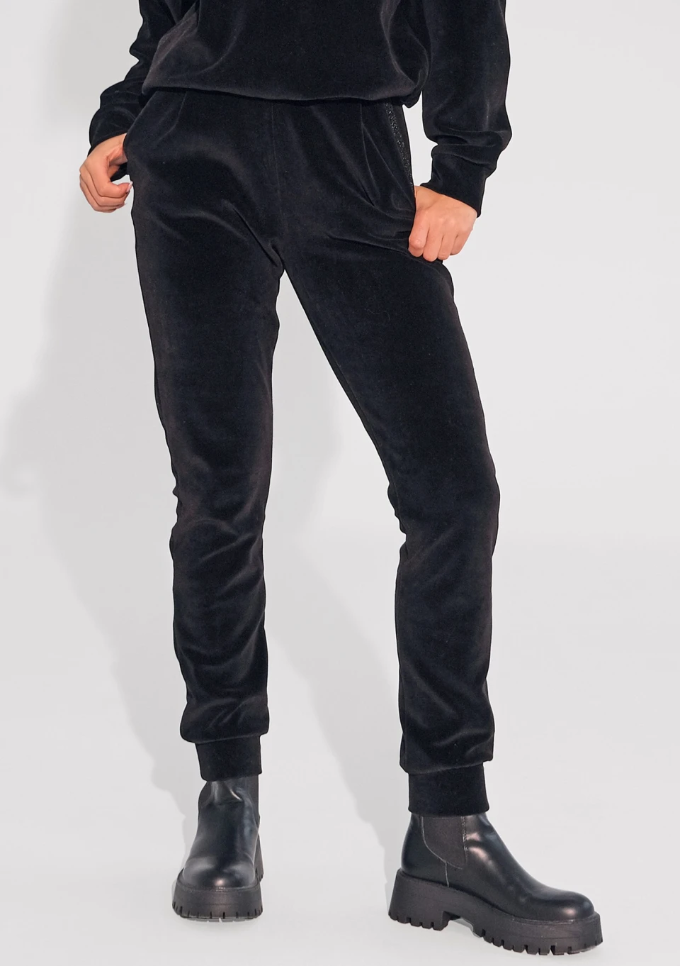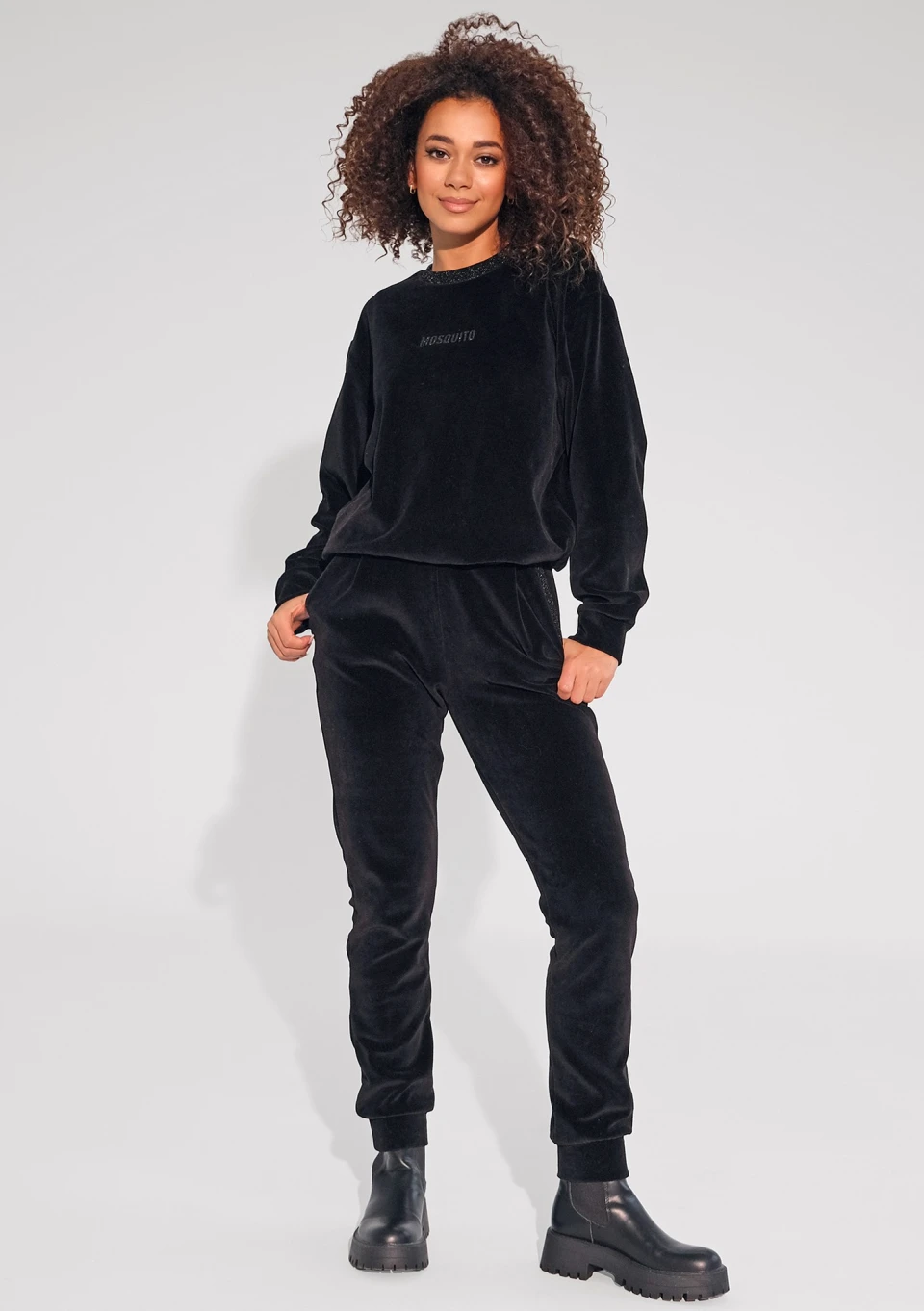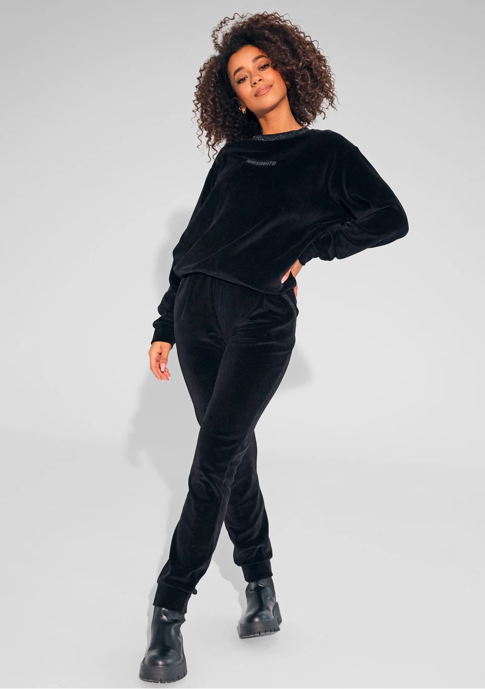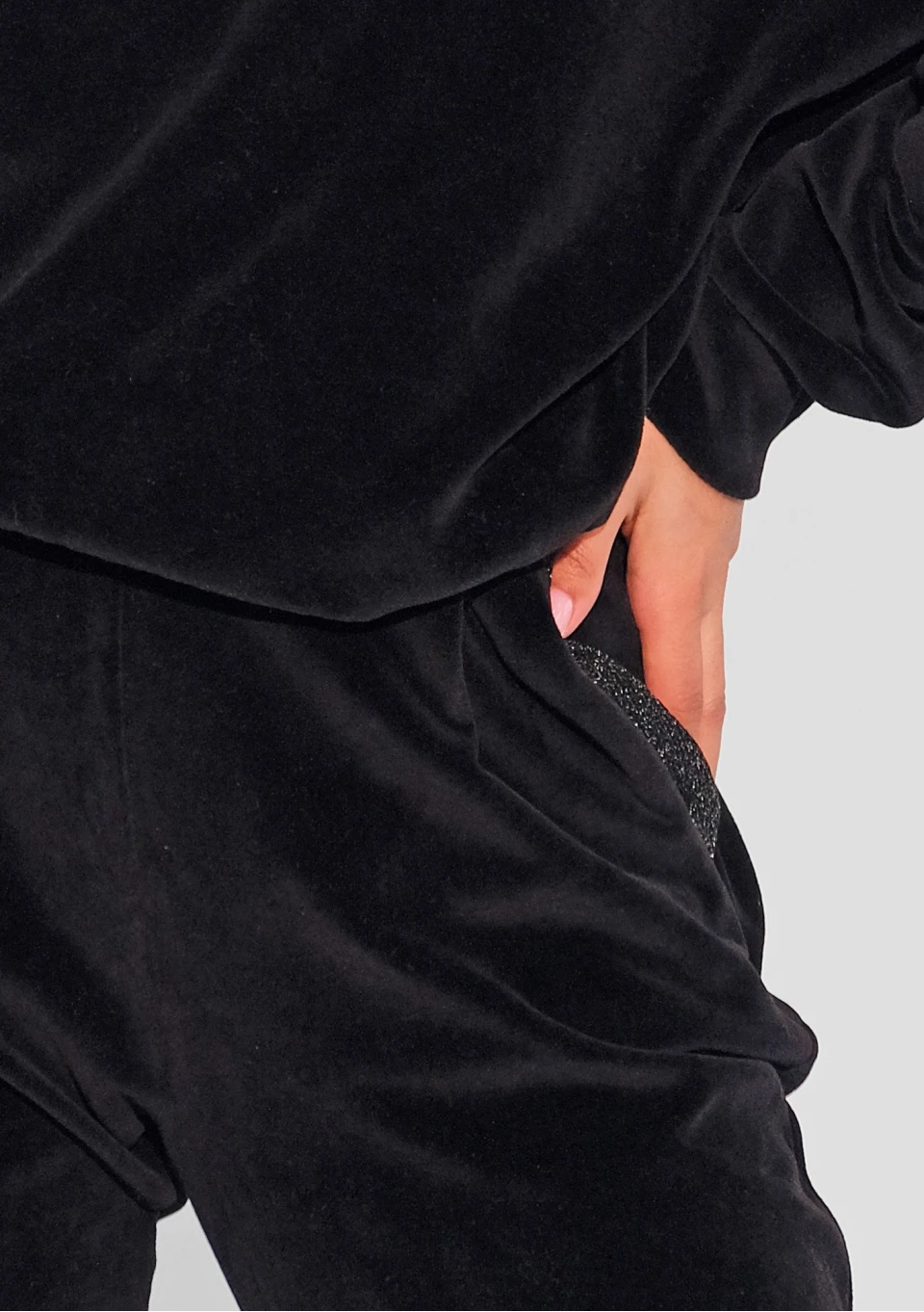 Czarne spodnie dresowe wykonane z gustownego weluru. Model o luźnym fasonie, na wygodnej gumie w pasie. Efektowną ozdobę stanowi błyszczące obszycie kieszeni.
