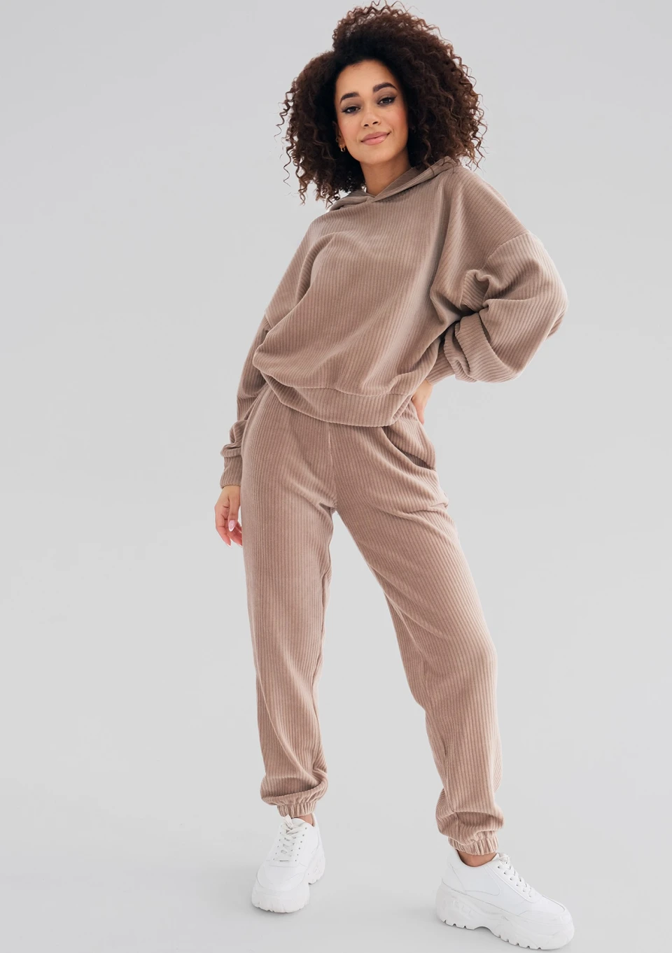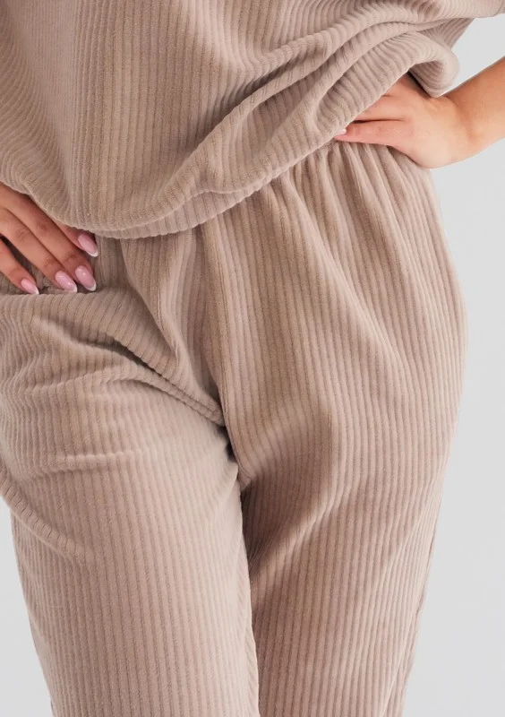 Beżowe spodnie damskie zdobione prążkowaną fakturą. Wykonane w polskiej szwalni z miękkiej dzianiny welurowej.