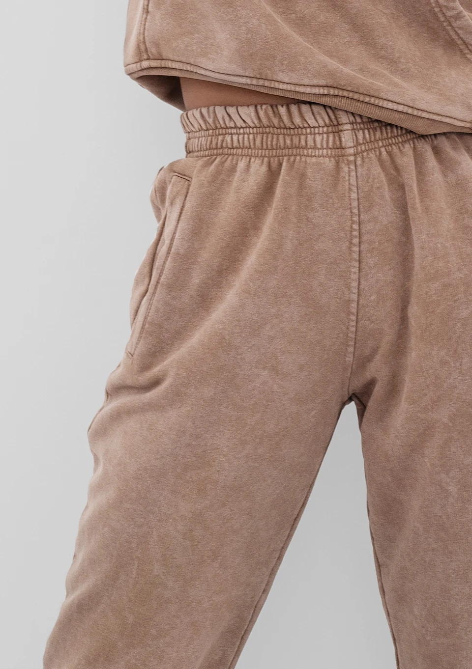 Wygodne spodnie dresowe w odcieniu kawy. Model z modnym efektem sprania, z materiału z miękkim meszkiem od spodu.