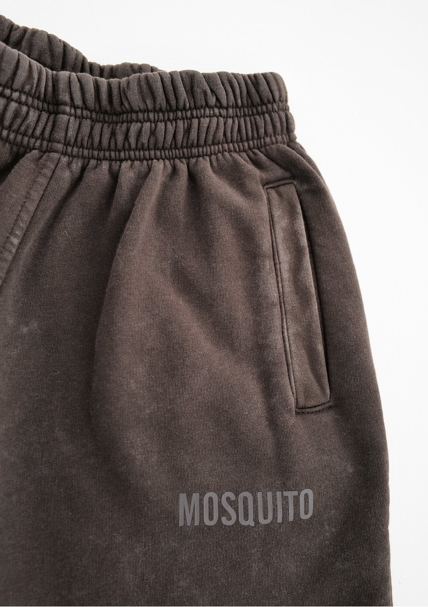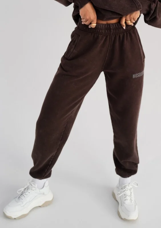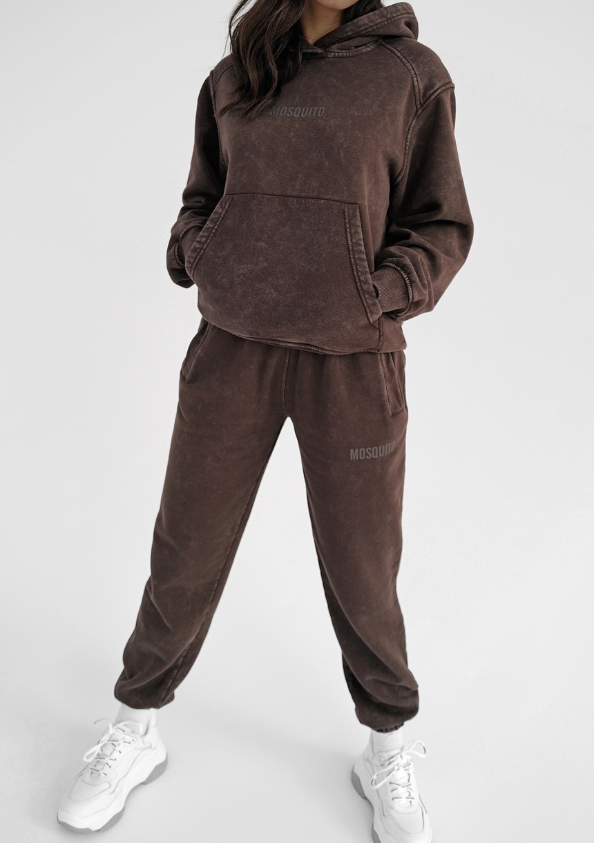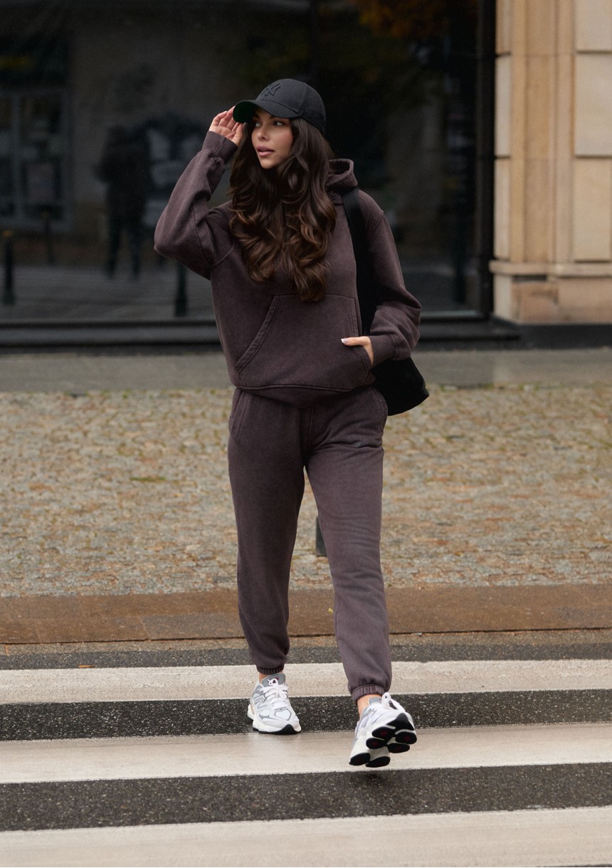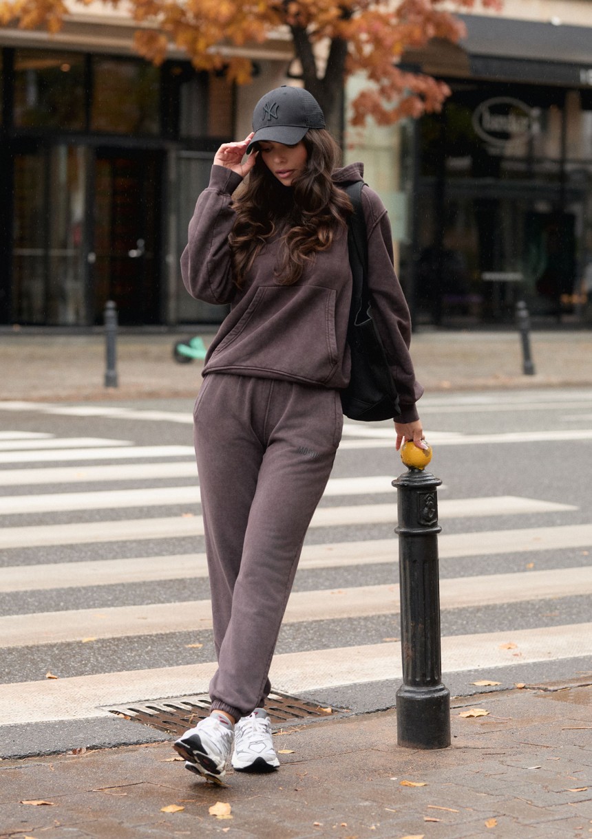 Wygodne spodnie dresowe w ciemnym brązie. Model z modnym efektem sprania, z materiału z miękkim meszkiem od spodu.
