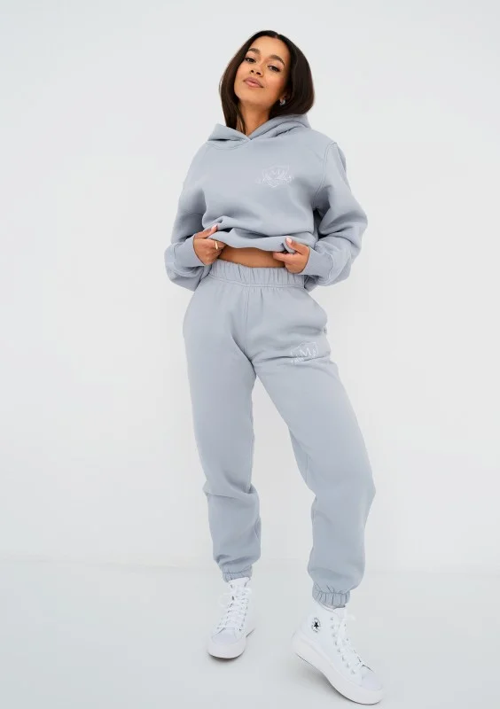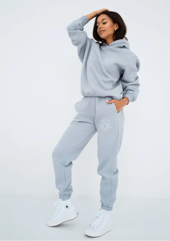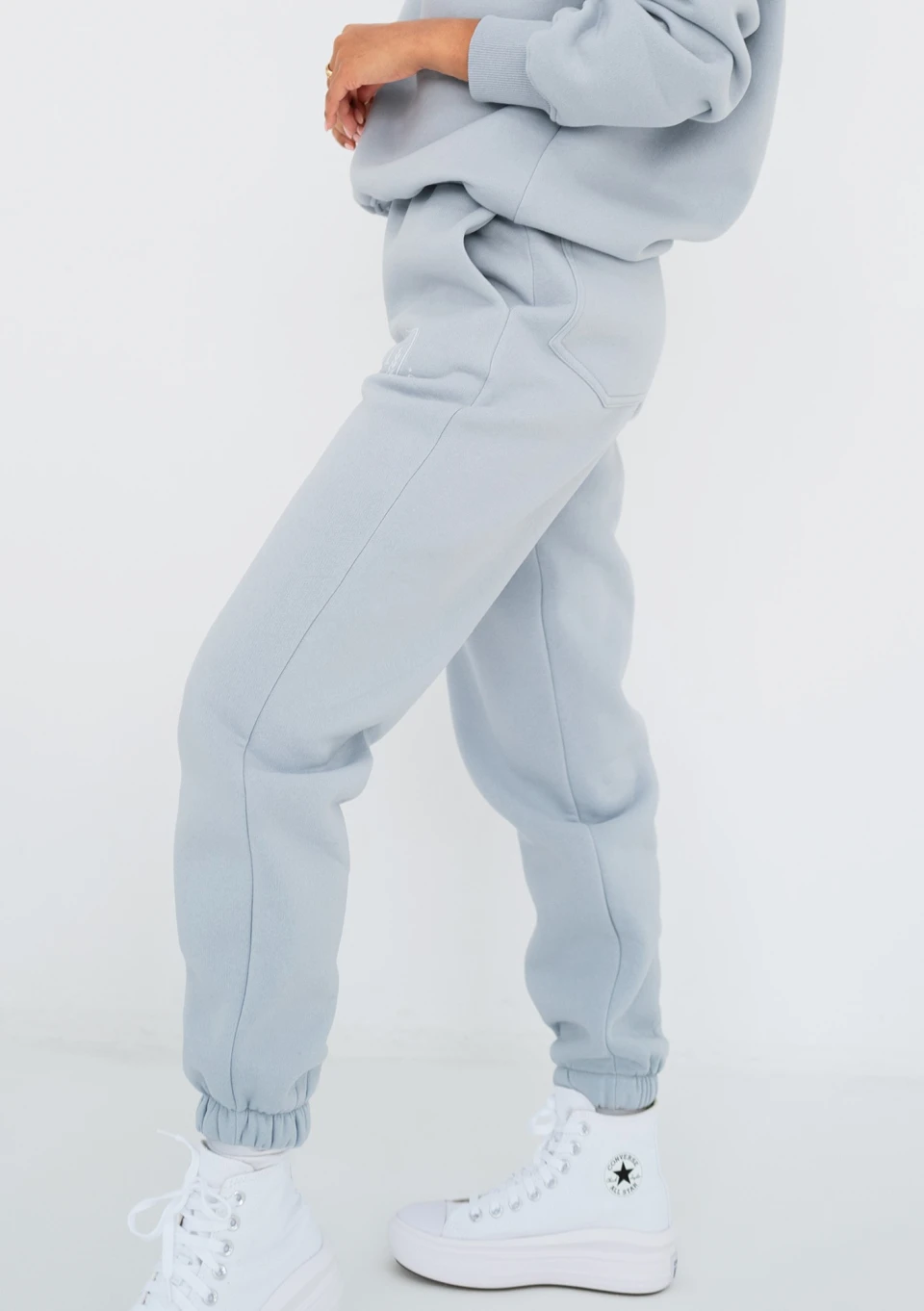 Błękitne spodnie dresowe zdobione wyjątkowym logiem. Wykonane z miękkiej dzianiny z meszkiem. Model o wygodnej formie oversize.