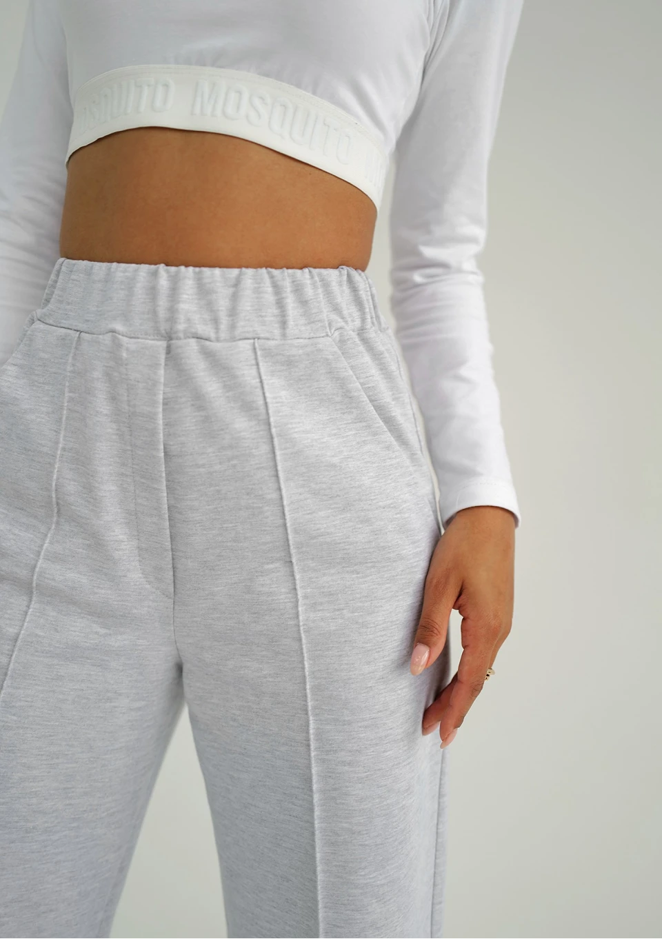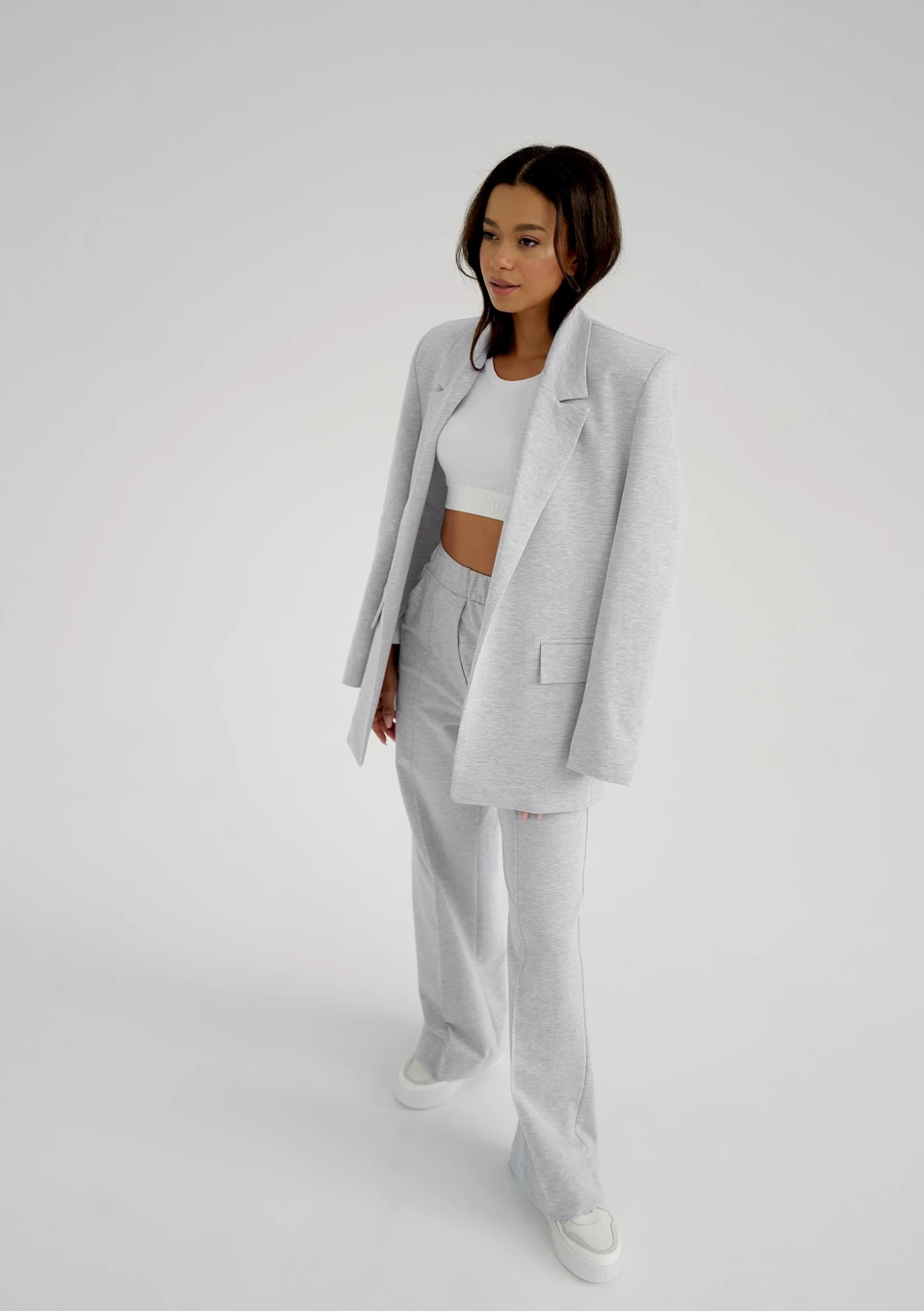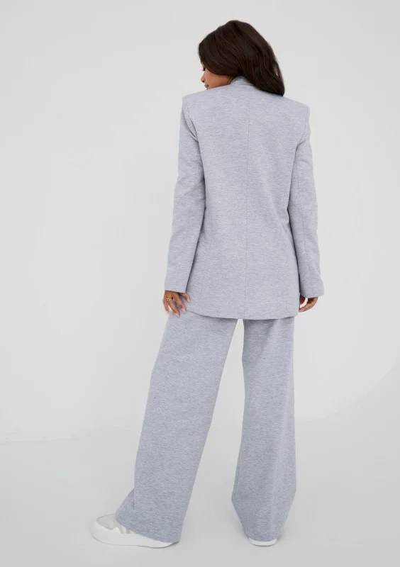 Stylowe spodnie o bardzo luźnych nogawkach w jasnej, melanżowej szarości. To najmodniejszy fason z delikatnie eleganckim efektem.