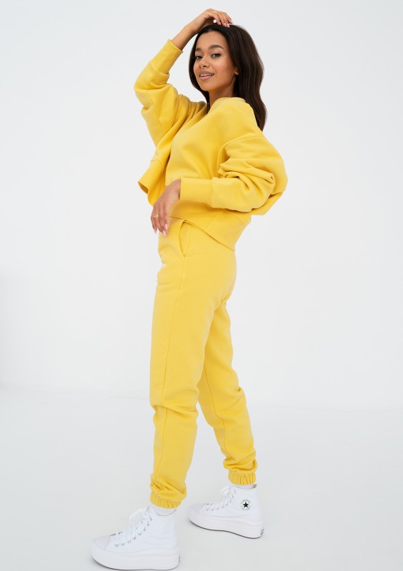 Wygodne spodnie dresowe z kieszeniami w optmistycznym, żółtym kolorze. Wykonane z dzianiny bawełnianej z miękkim meszkiem od spodu.