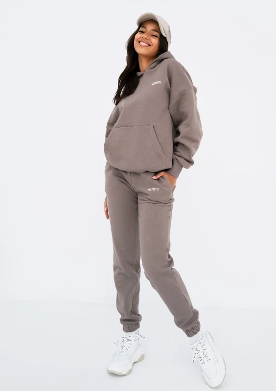 Wygodne spodnie dresowe z kieszeniami. Wykonane w odcieniu taupe, z dzianiny bawełnianej z miękkim meszkiem od spodu.