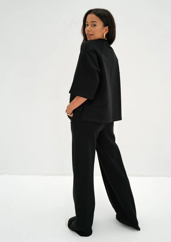 Czarne spodnie damskie z szeroką nogawką i kantem, wykonane z miękkiej dzianiny bawełnianej. Wygodny fason z gumą w pasie i kieszeniami.