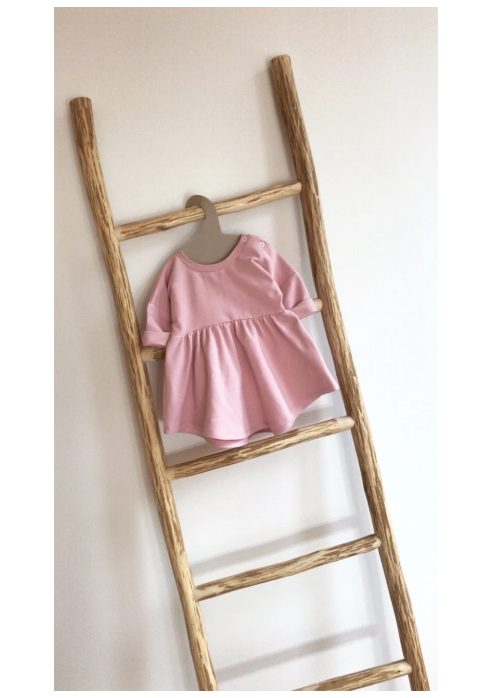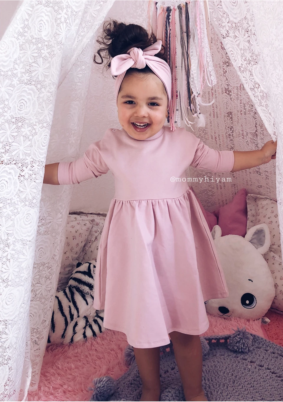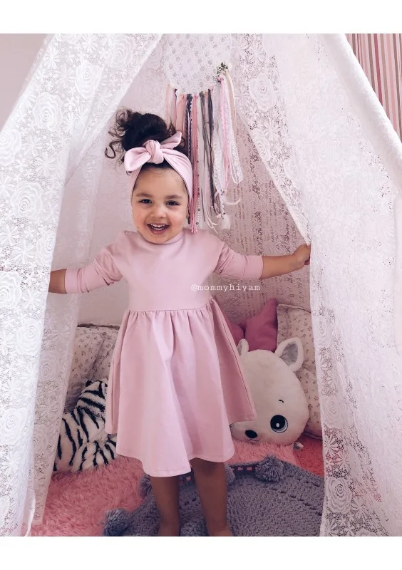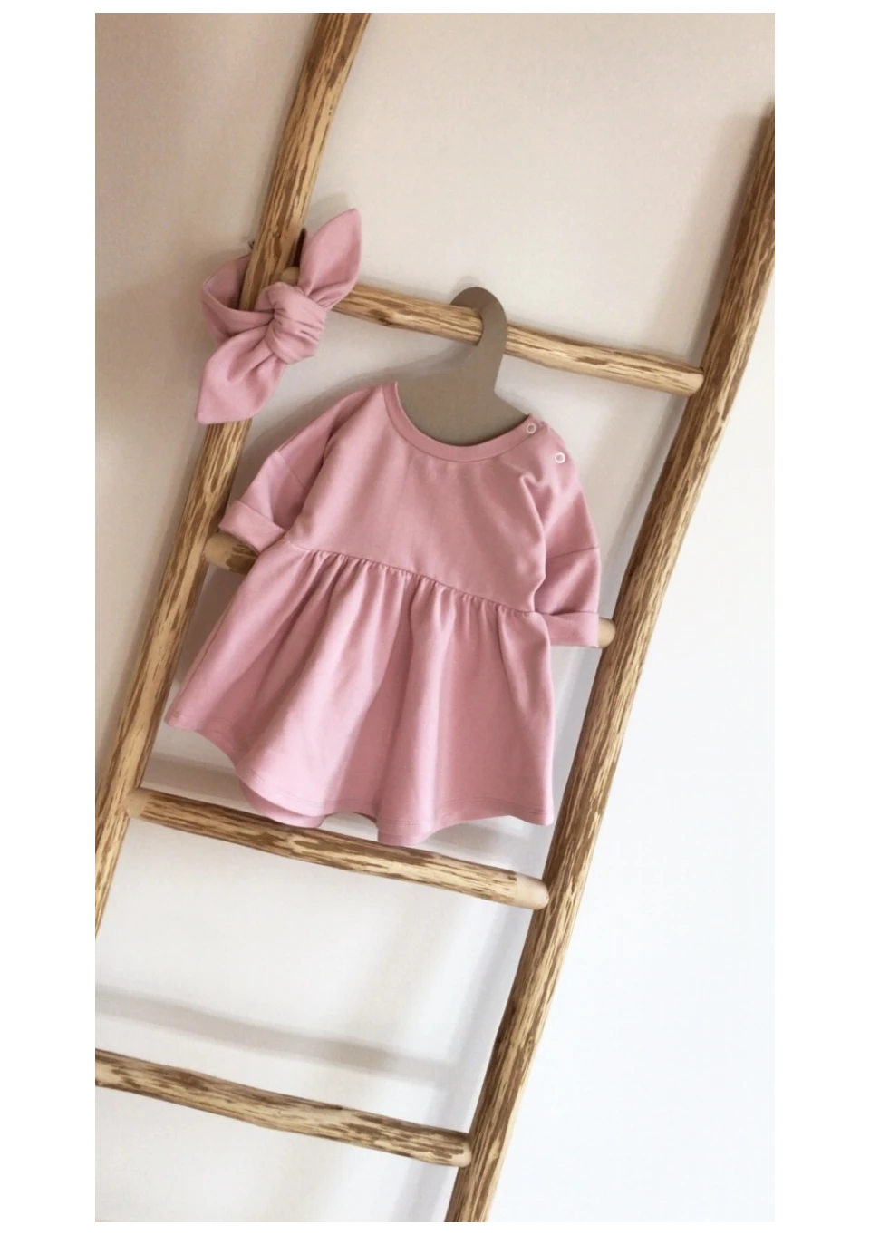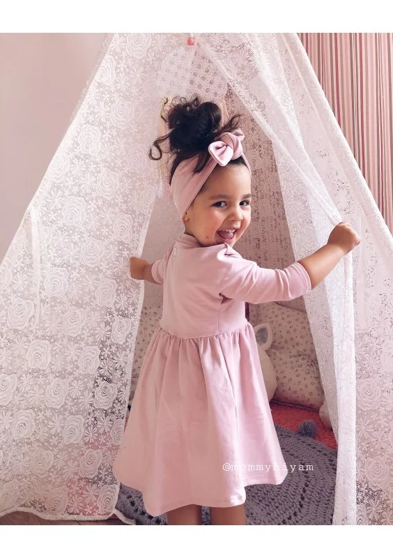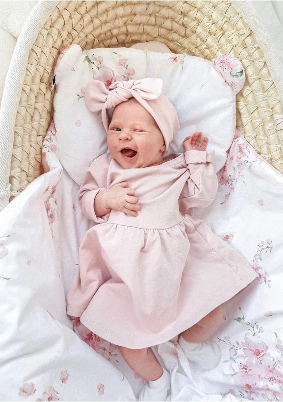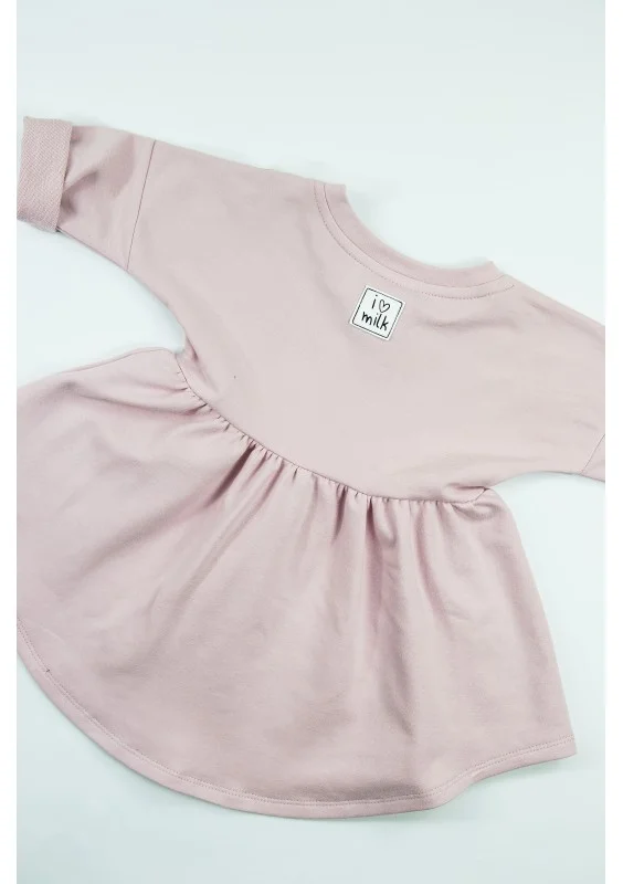 Różowa sukienka dla dziewczynki z naturalnego, elastycznego materiału. Uszyta z bawełny, delikatna dla dziecięcej skóry.