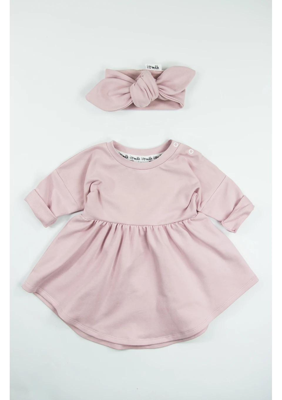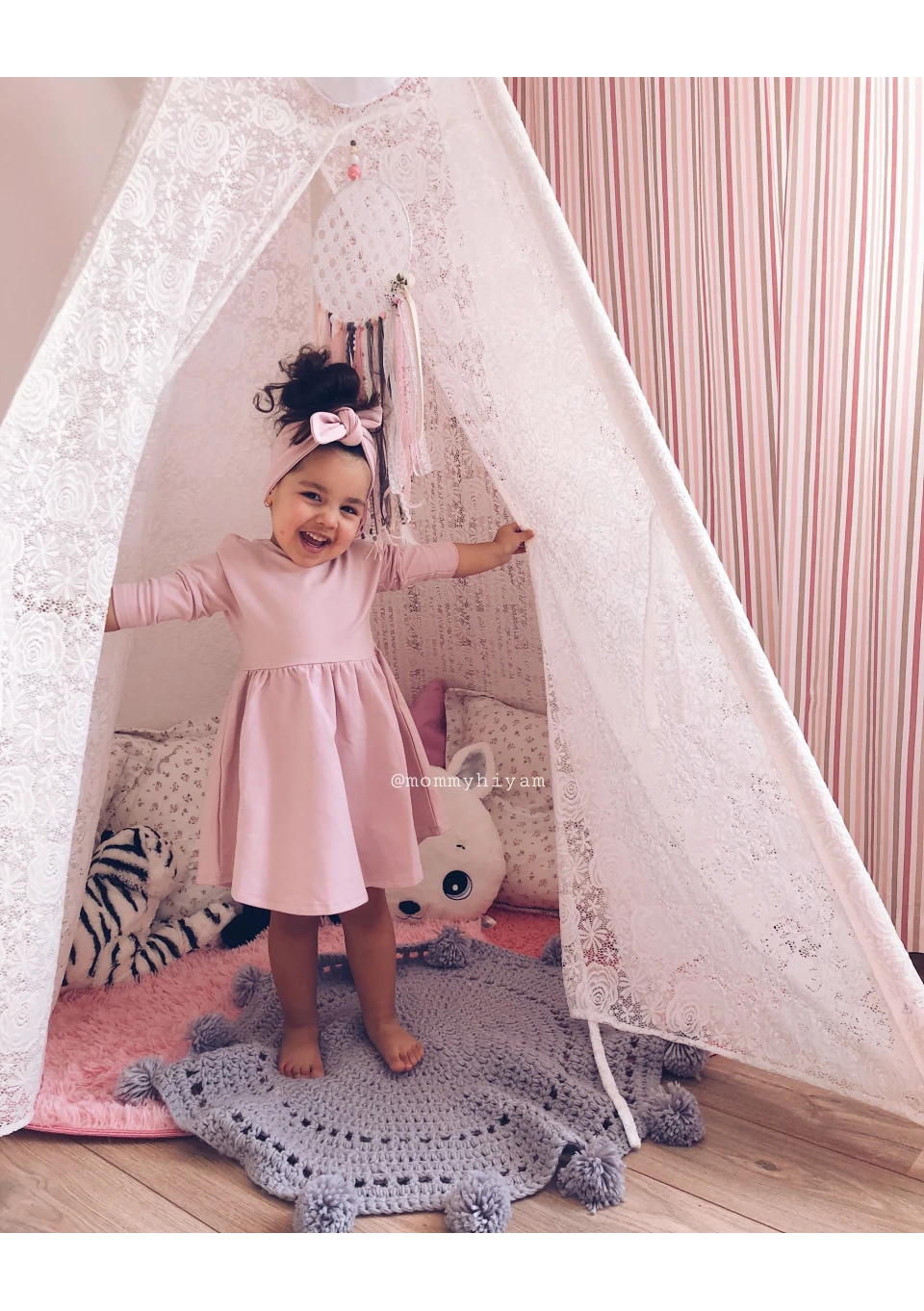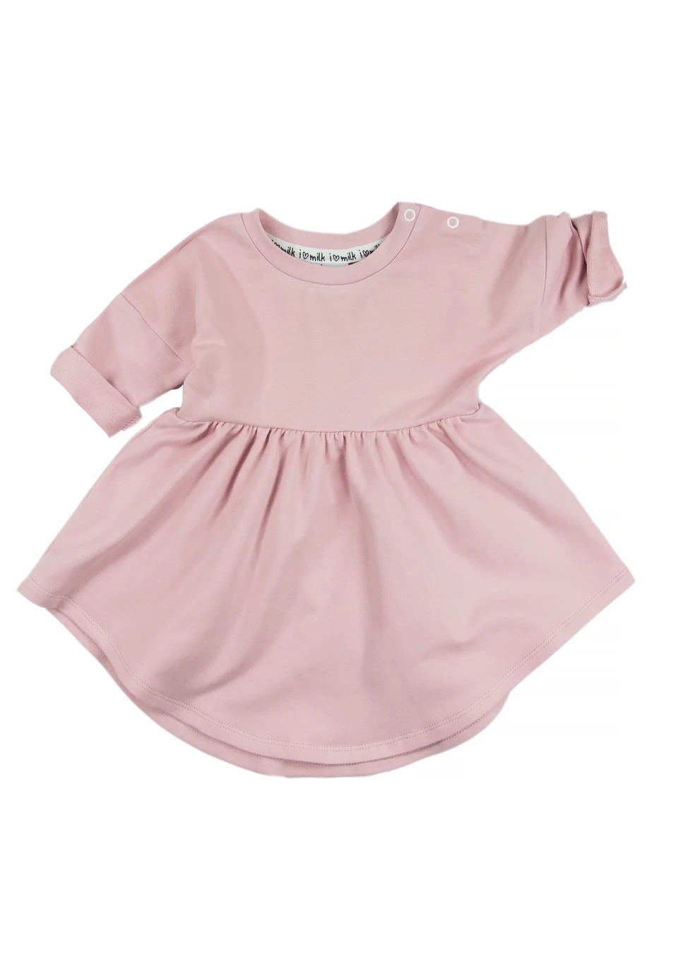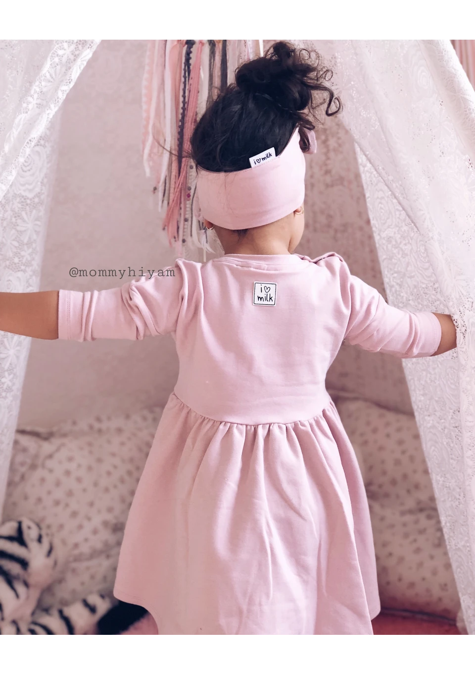 Różowa sukienka dla dziewczynki z naturalnego, elastycznego materiału. Uszyta z bawełny, delikatna dla dziecięcej skóry.