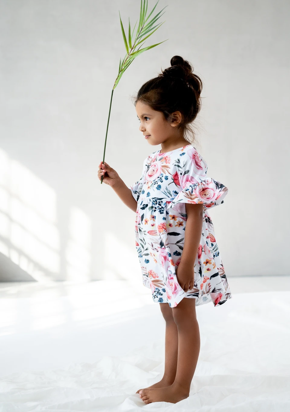 Śliczna sukienka dziewczęca łączy w sobie biel z delikatnymi, kolorowymi kwiatami. Wzór, a także urocze falbanki przy rękawach sprawią, że każda mała księżniczka będzie prezentowała się pięknie.