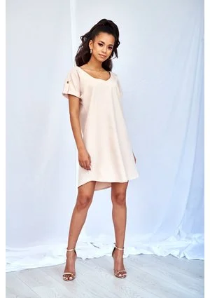 Prezentowany model to propozycja dla kobiet w różnym wieku; sukienka pięknie podkreśla atuty sylwetki i gwarantuje wygodę podczas noszenia. Wszystko to za sprawą luźnego kroju, krótkich rękawów oraz subtelnego dekoltu w kształcie litery V. Całość uzupełniają oryginalne detale; zdejmowany pasek sprzedawany razem z sukienką, modne pagony na rękawach oraz duży dekolt na plecach. Modne detale i kobiecy fason to nie jedyne atuty prezentowanego modelu. Sukienka zachwyca również starannym wykończeniem i doborem wysokogatunkowego materiału, który doskonale przepuszcza powietrze, pięknie układa się na ciele oraz zapewnia nieograniczoną swobodę ruchów podczas noszenia. Sukienka dostępna jest w kilku wariantach kolorystycznych, w tym z kwiatowymi printami.