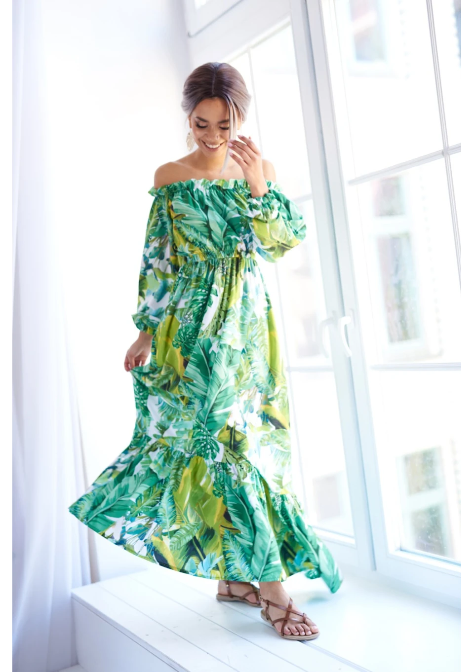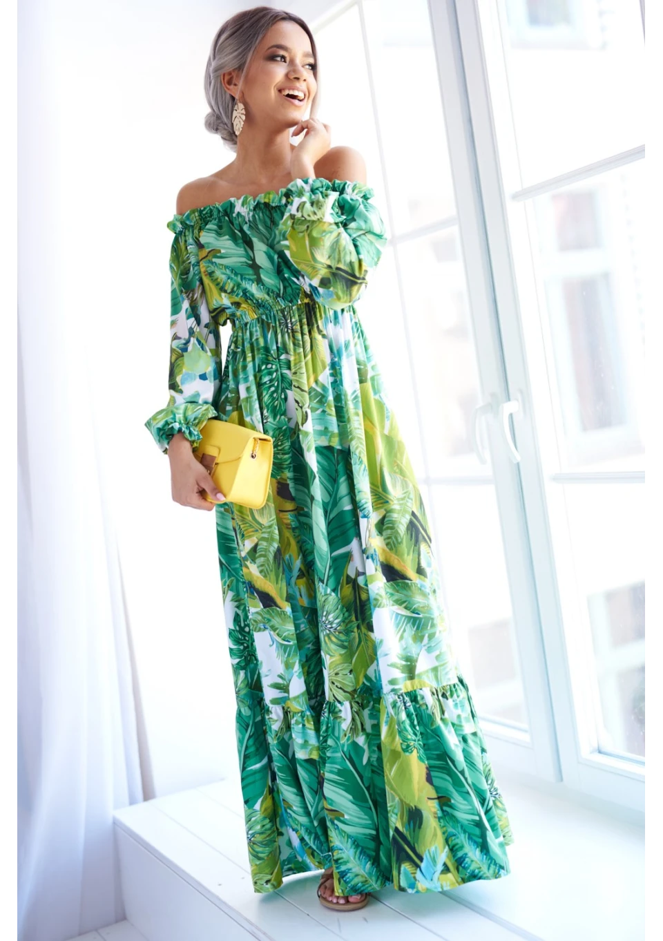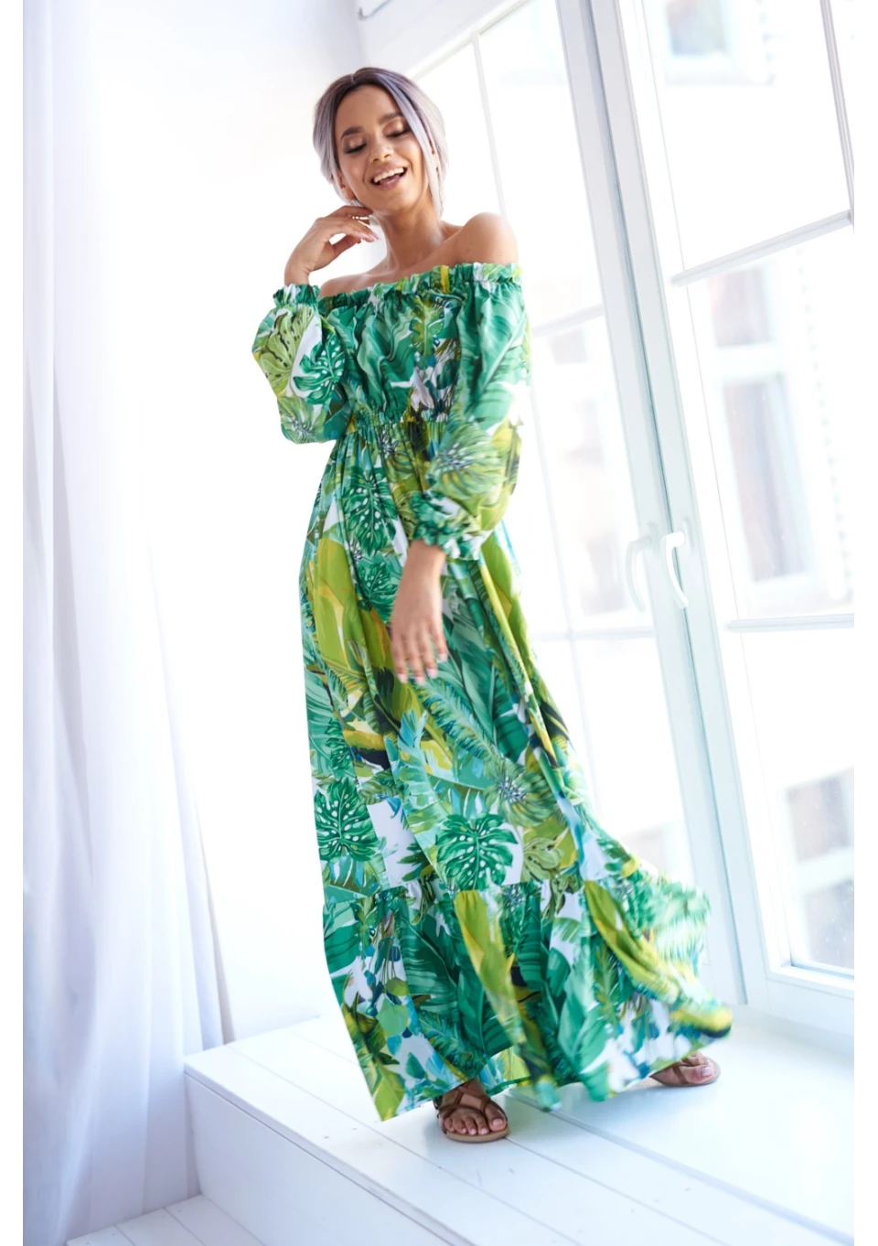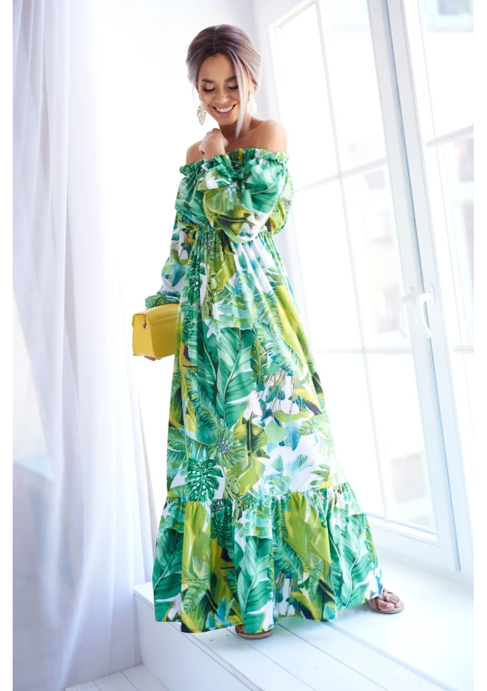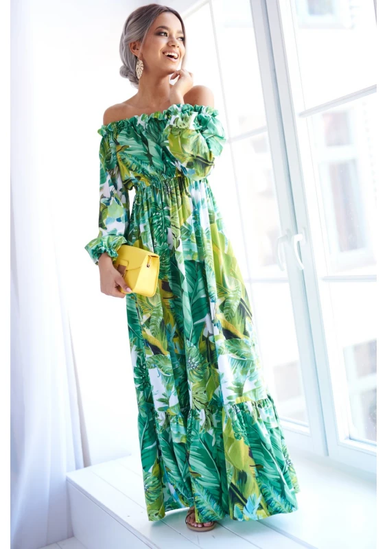 Zwiewna sukienka maxi to gorący must have na lato. Bestsellerowa kreacja przyciąga uwagę wzorem egzotycznych liści. Efektowna i wygodna, idealna na plażę, jak i ważną kolację.