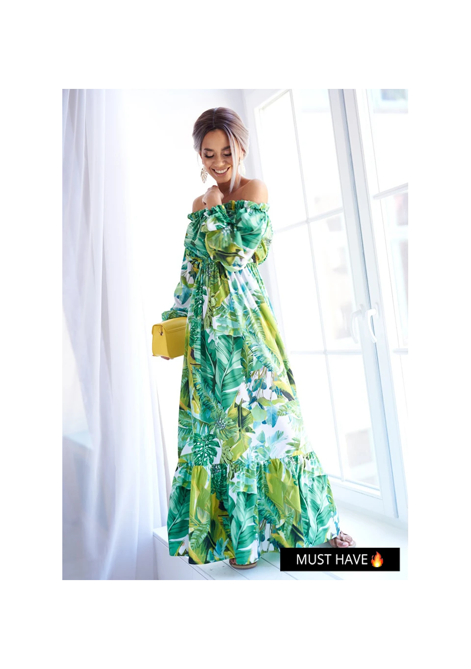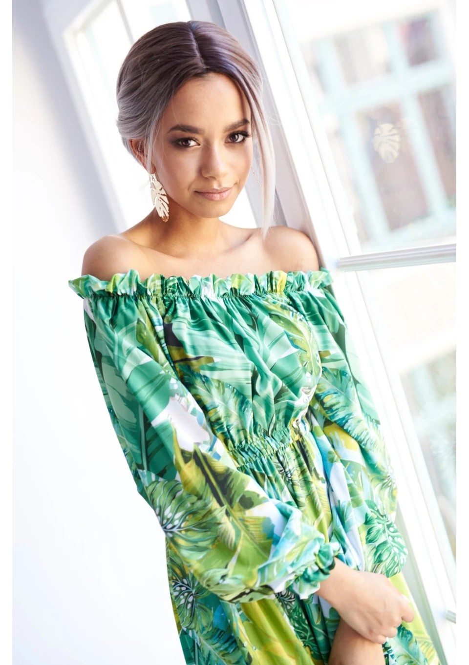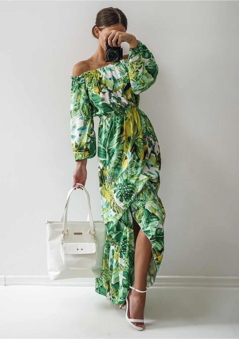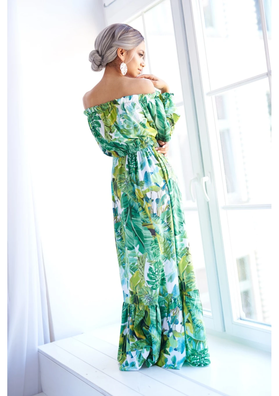 Zwiewna sukienka maxi to gorący must have na lato. Bestsellerowa kreacja przyciąga uwagę wzorem egzotycznych liści. Efektowna i wygodna, idealna na plażę, jak i ważną kolację.