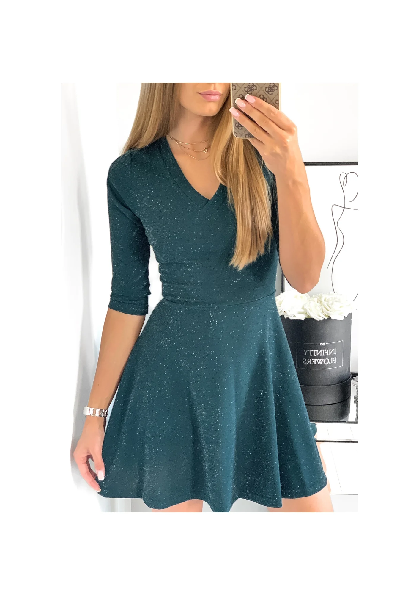 Model Shine to zmysłowa propozycja dla fanek klasycznych fasonów i modny, intensywnych kolorów - sukienka z krótką, rozkloszowaną spódnicą i dopasowaną górą świetnie sprawdzi się jako dodatek do wielu modnych stylizacji. Uniwersalny charakter, oryginalna kolorystyka i kobiecy fason to jednak nie wszystkie atuty prezentowanego modelu - produkt zaprojektowany przez Alicję Komar wyróżnia się też subtelnym odcięciem w pasie i klasycznym dekoltem w kształcie litery V; całość uzupełniają dopasowane rękawy o długości ¾ , które gwarantują komfort i wygodę podczas noszenia. Ten ultra kobiecy model z pewnością przypadnie też do gustu kobietom kochającym błysk i mieniące się detale; wszystko to za sprawą błyszczącej tkaniny, która pięknie odbija światło i subtelnie błyszczy przy każdym, nawet najmniejszym ruchu.