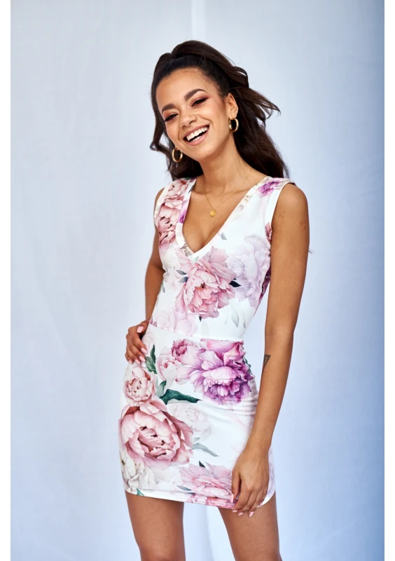 Alexa - Letnia sukienka mini na ramiączkach w kwiatki Ecru