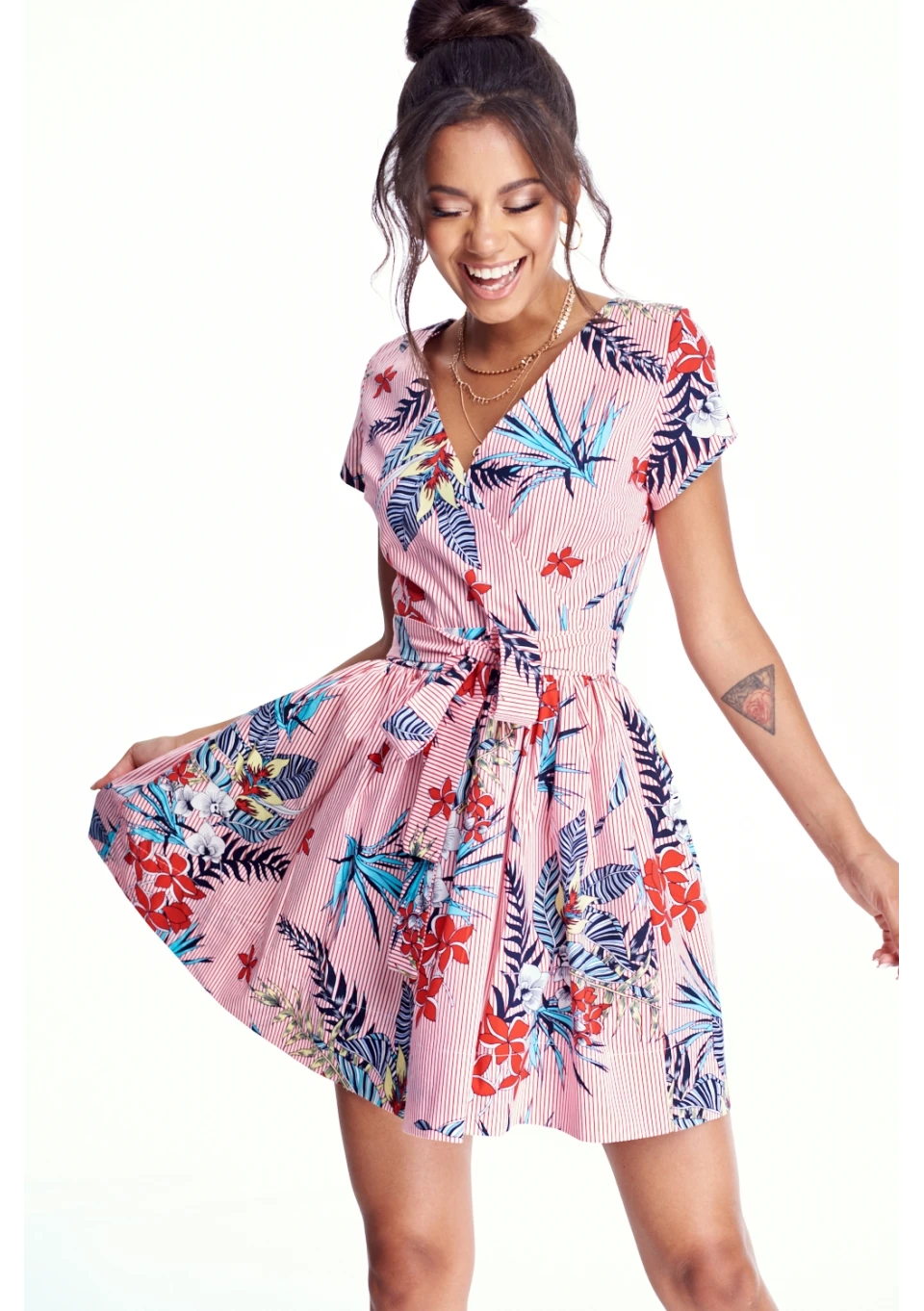 Sukienka zachwyca również klasycznym, wdzięcznym fasonem, który z jednej strony pięknie układa się na sylwetce, zaś z drugiej - subtelnie podkreśla kobiece atuty. Rozkloszowany dół o długości przed kolano pięknie eksponuje nogi i podkreśla wcięcie w talii. Elegancka kopertowa góra zwraca uwagę na subtelny dekolt i ramiona; całość uzupełniają krótkie, lekko odstające rękawki. Oryginalnym akcentem jest też urocza kokardka w pasie, która dodaje modelowi lekkości i wdzięku. Wszystko to sprawia, że krótka, popelinowa sukienka świetnie sprawdzi się jako baza wielu stylizacji - możesz ją nosić w zestawie z ulubionymi trampkami, modnymi sneakersami, a nawet letnimi, oryginalnymi sandałkami. Gwarantujemy, że efekt powali niejednego na kolana!