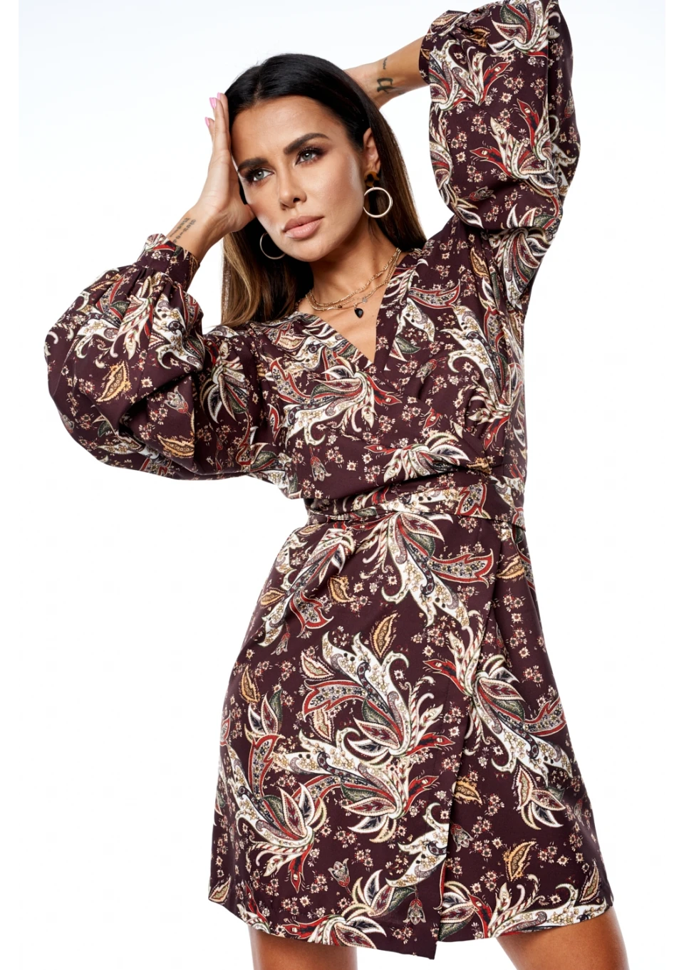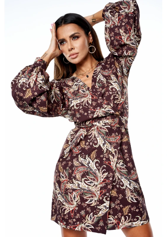 Sukienka z szerokim rękawem w jesienny print