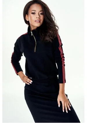 Czarna ołówkowa sukienka to bardzo uniwersalny strój, który powinien znaleźć się w szafie każdej kobiety. Dostępny tu model ma sportowy i nieformalny charakter. Sukienka została uszyta z materiału, który w 95% składa się z bawełny, co sprawia, że jest bardzo wygodna, przyjemna w dotyku i doskonale sprawdzi się w różnych sytuacjach. Możesz ją założyć zarówno na imprezę, jak i na spacer, a także do szkoły czy na uczelnię. Ten model ma przylegający krój i świetnie podkreśla kobiecą sylwetkę, ponadto rozciągliwy kształt pozwoli na dopasowanie jej do każdej figury. Długość przed kolano sprawia, że sukienka eksponuje zgrabne nogi noszącej ją kobiety, ale nie ma zbyt wyzywającego charakteru. Uwagę przyciąga kontrastujący zamek i czerwone lampasy na rękawach. W tę sukienkę powinna zaopatrzyć się każda kobieta, która dba o modny wygląd i stara się zawsze być na czasie.