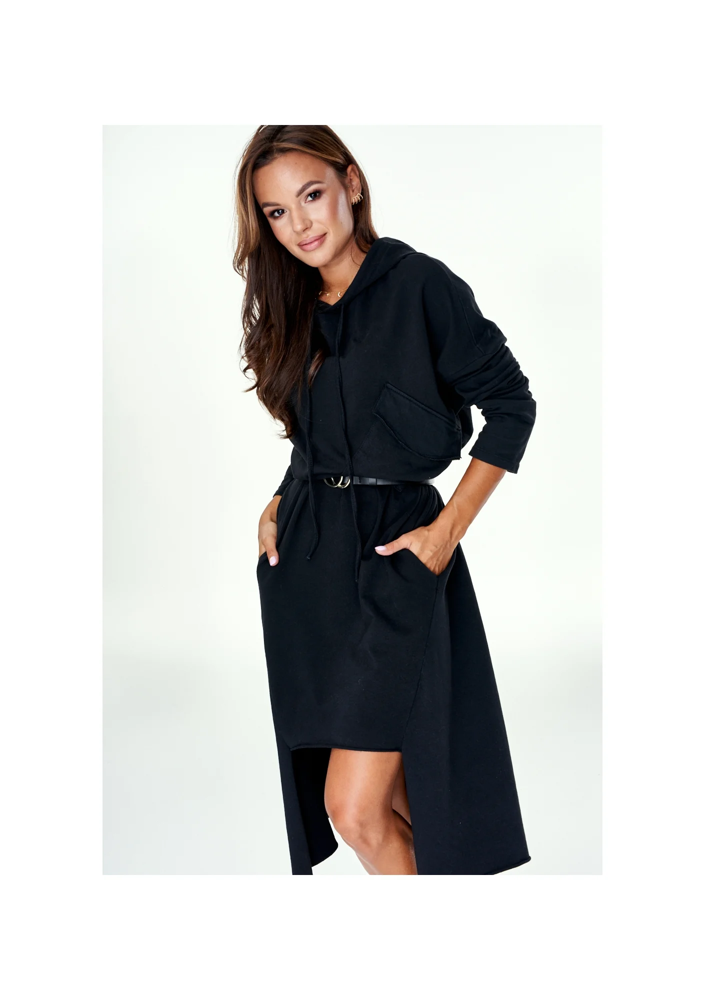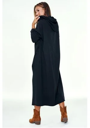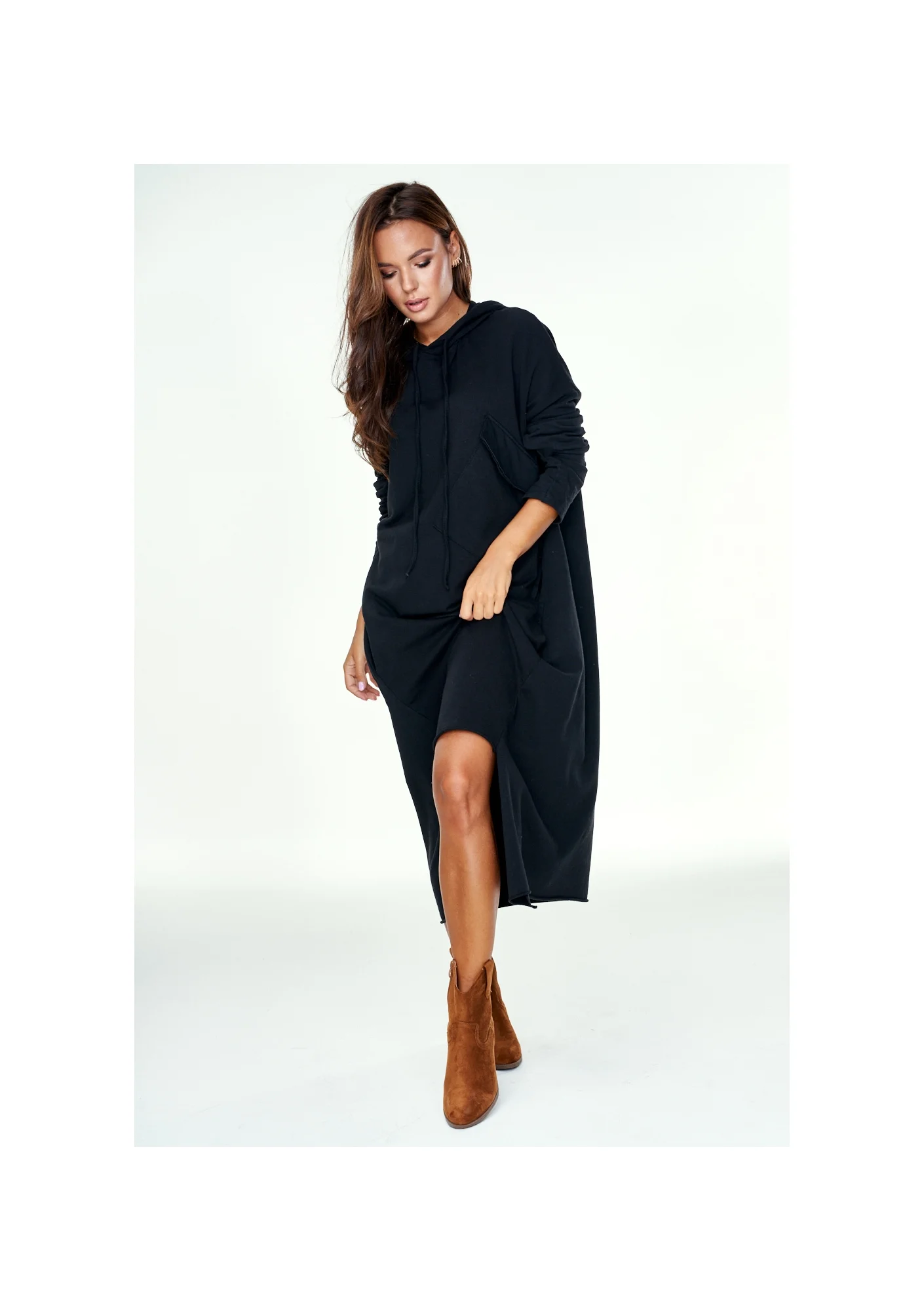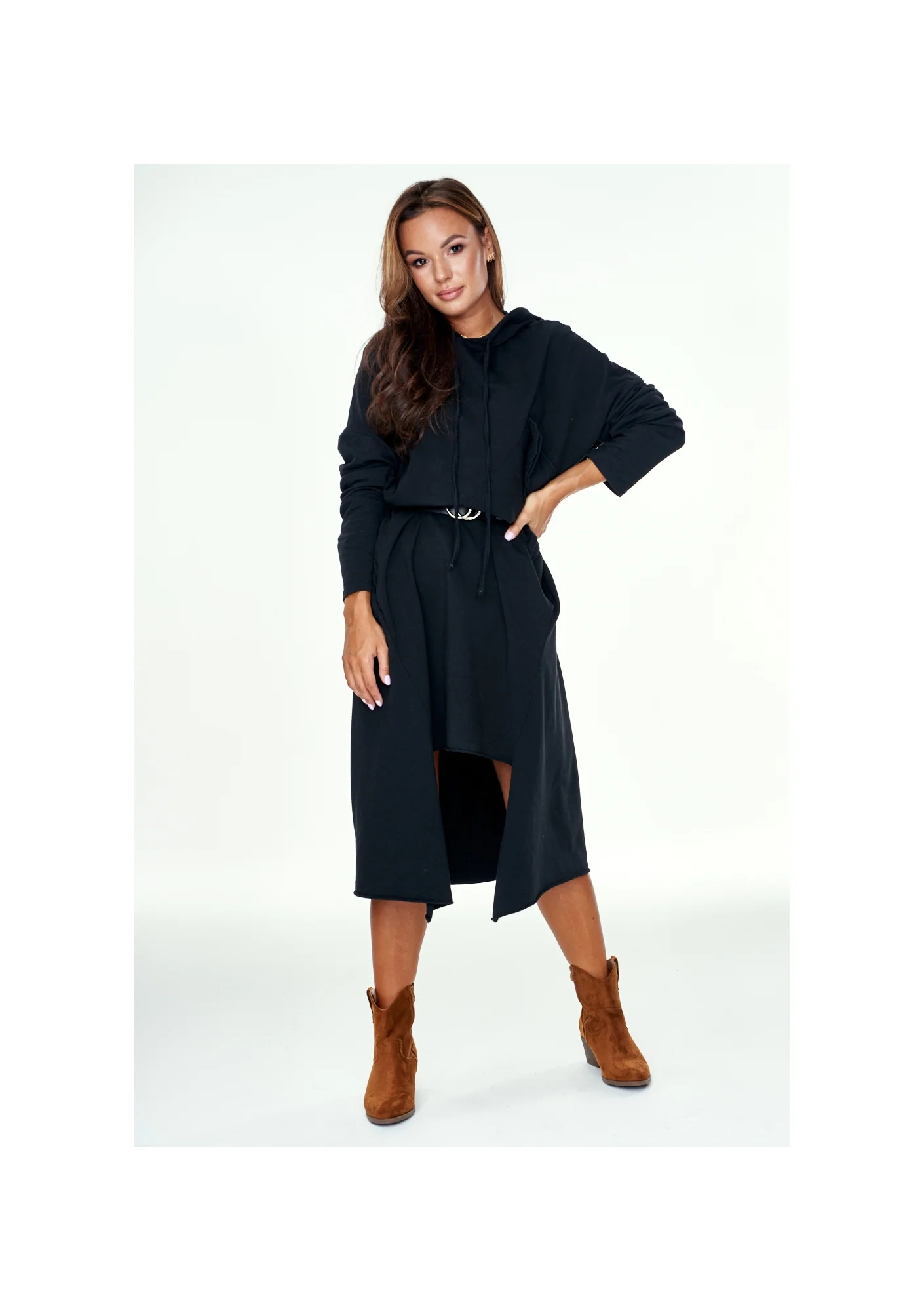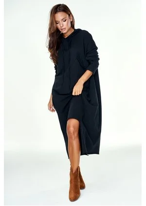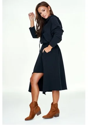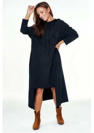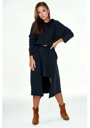 Niecodzienna tunika z kapturem o asymetrycznym kroju to gratka dla kobiet szukających oryginalnych stylizacji. Dzięki wyjątkowo długiemu tyłowi, świetnie sprawdza się jako samodzielny strój. Krótszy przód atrakcyjnie podkreśla nogi. Oversizowy krój sprawia, że tunika jest idealnym strojem dla pań niepewnych swojej figury. Doskonale zatuszuje wszelkie mankamenty, tym samym podnosząc pewność siebie i pozwalając poczuć się atrakcyjnie. Może też seksownie podkreślać sylwetkę. Wystarczy połączyć ją z grubym pasem w talii, żeby wyeksponować kształty i stworzyć bardziej seksowny look. Całość została wykonana z bawełny dzianinowej, która jest miękka i ciepła. Kaptur może dodatkowo chronić przed wiatrem. Noszenie tuniki to prawdziwa przyjemność! Pasują do niej buty typowe dla chłodniejszych dni, w tym botki, sztyblety i kozaki.