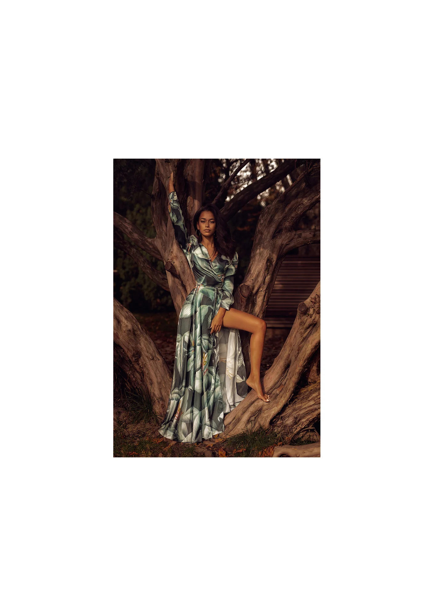 Zgłoś nielegalną treśćSukienka maxi Dark Leaves to niepowtarzalna propozycja dla odważnych kobiet. Ta sięgająca ziemi kreacja o kopertowym kroju wyposażona jest w naprawdę głęboki dekolt eksponujący efektownie biust. Krój kopertowy oznacza, że poły sukienki zachodzą na siebie, tworząc kształt kojarzący się z kopertą, a jednym z atutów tego kroju jest rozporek spódnicy sięgający prawie do samego biodra. W związku z tym pozwala na kuszącą prezentację nogi. W momencie, gdy stoisz, sukienka prezentuje się dość skromnie, zwłaszcza że jest to model z długim rękawem, jednak w tańcu zdecydowanie zyskuje na atrakcyjności.