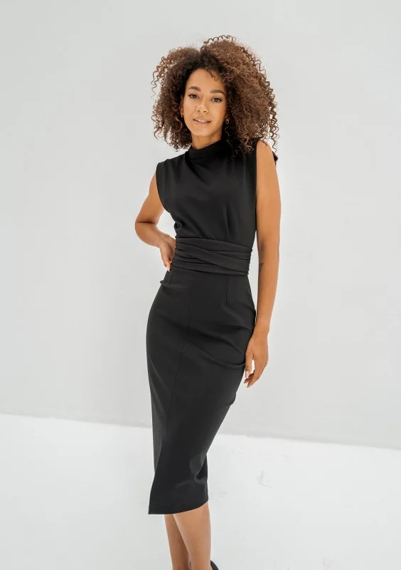 Czarna sukienka ołówkowa midi z rozcięciem i wiązaniem. Zachowuje pełną elegancję i dodaje seksapilu zarysem sylwetki.