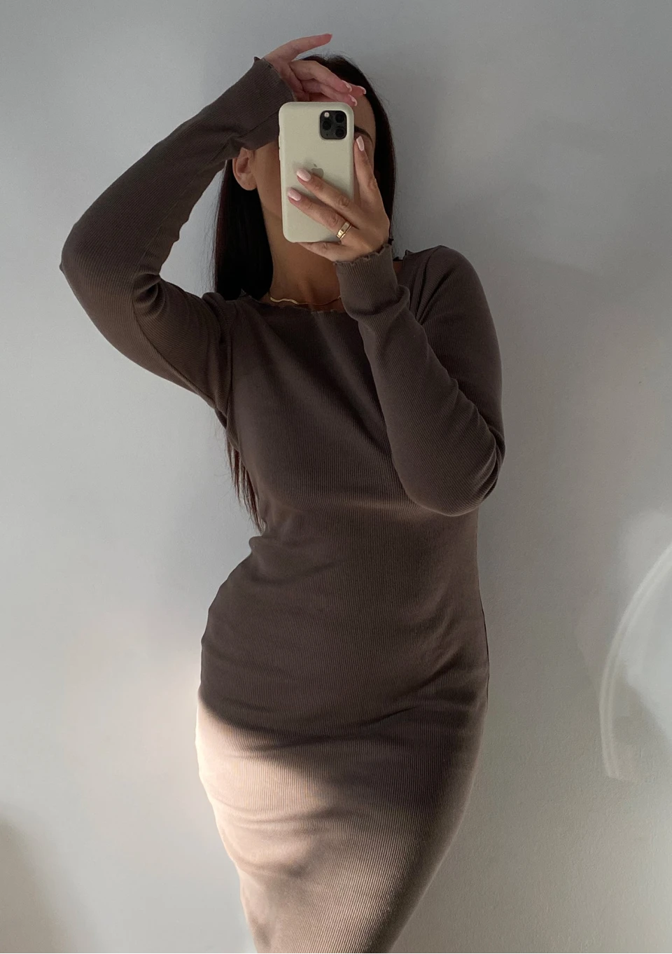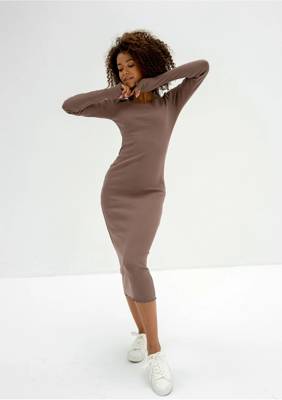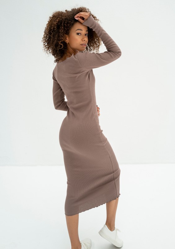 Brązowa sukienka bawełniana midi z prążkowanej dzianiny. Model bodycon zmysłowo podkreśli figurę i nada się do różnych kombinacji.