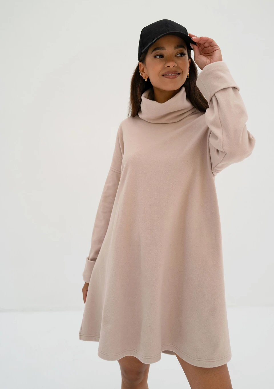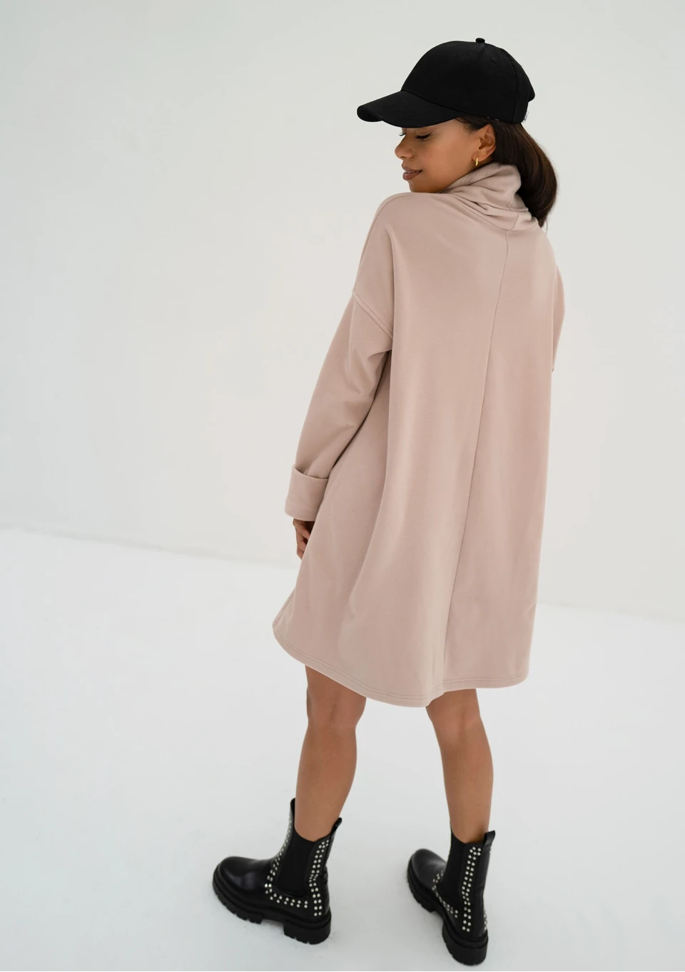 Luźna sukienka z golfem Cambelle została uszyta z dzianiny dresowej, co sprawia, że jest odrobinę sportowa i bardzo wygodna. Możesz nosić ją w samodzielnej stylizacji, a także jako tunikę do legginsów w chłodniejsze dni. Model posiada luźną, lekko oversizową formę, w której poczujesz się swobodnie i komfortowo. Będziesz wyglądać dobrze, niezależnie od ewentualnych niedoskonałości sylwetki!