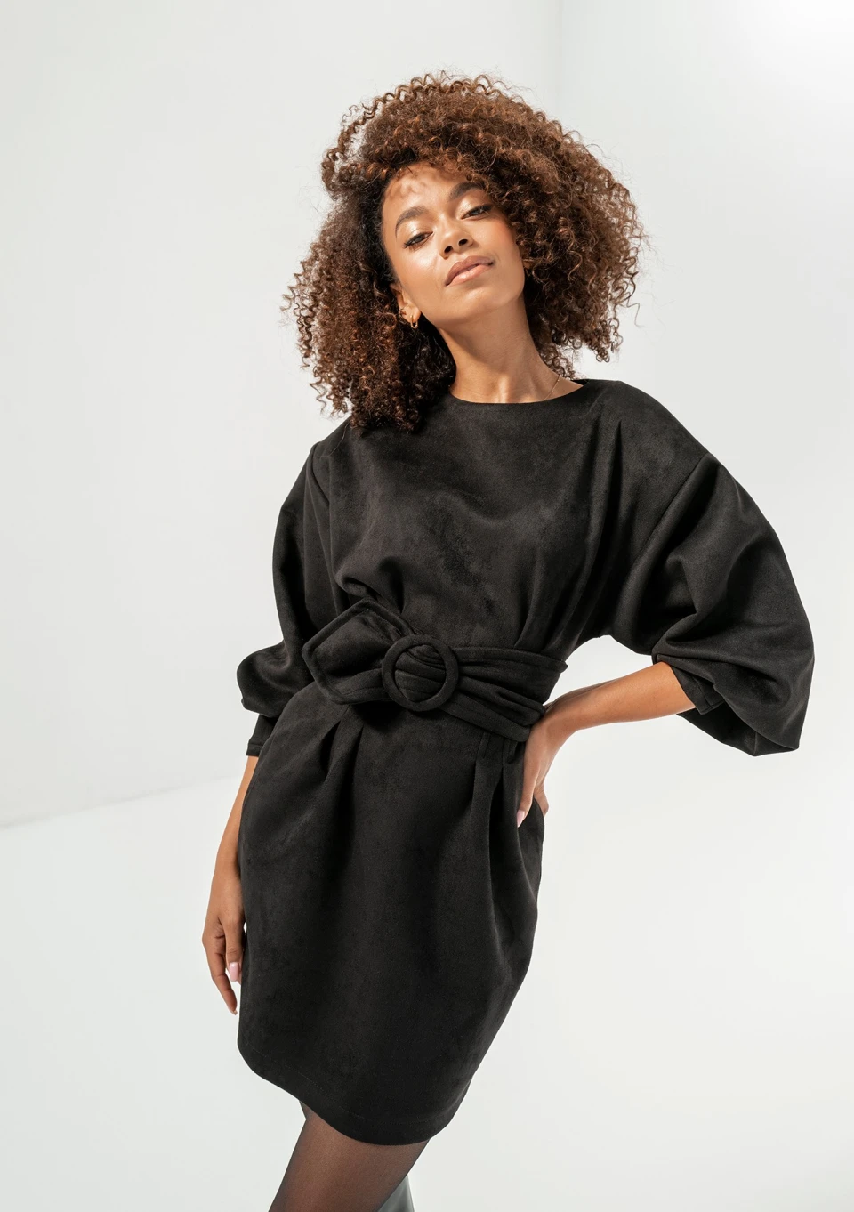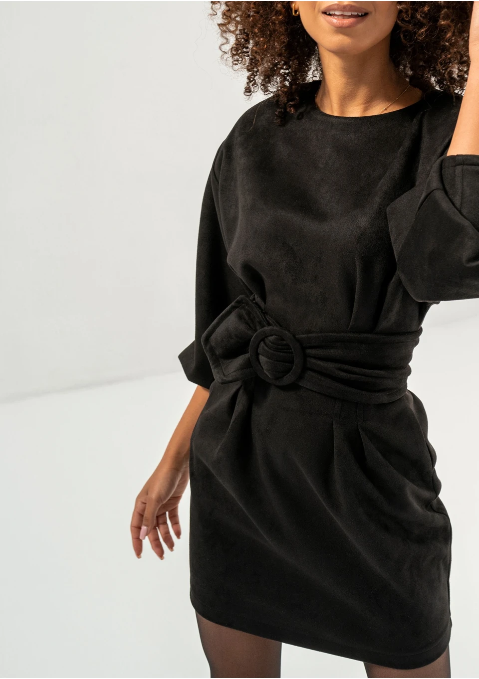 Czarna sukienka mini z imitacji zamszu o ołówkowym kroju, w komplecie z paskiem. Posiada komfortową, delikatnie elastyczną strukturę materiału.