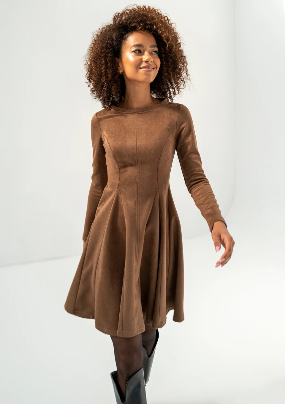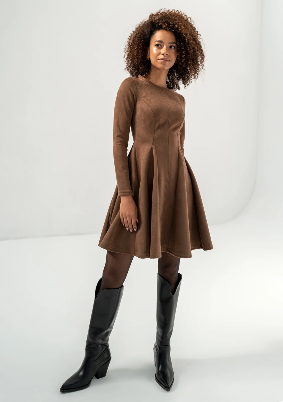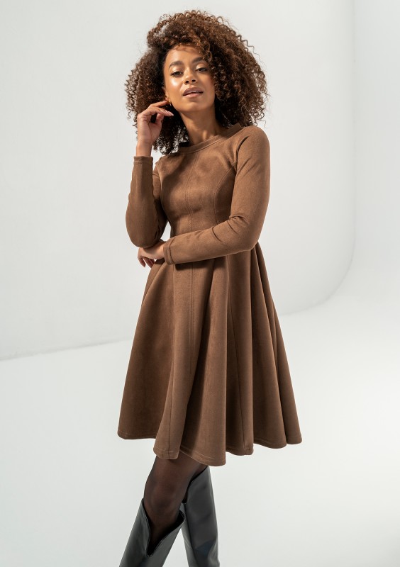 Zamszowa sukienka w brązowym kolorze, wykonana z doskonałej imitacji. Kobieca, rozkloszowana forma dodaje uroku. Kelle to sukienka na co dzień, do pracy, jak i na popołudniową kawę.
