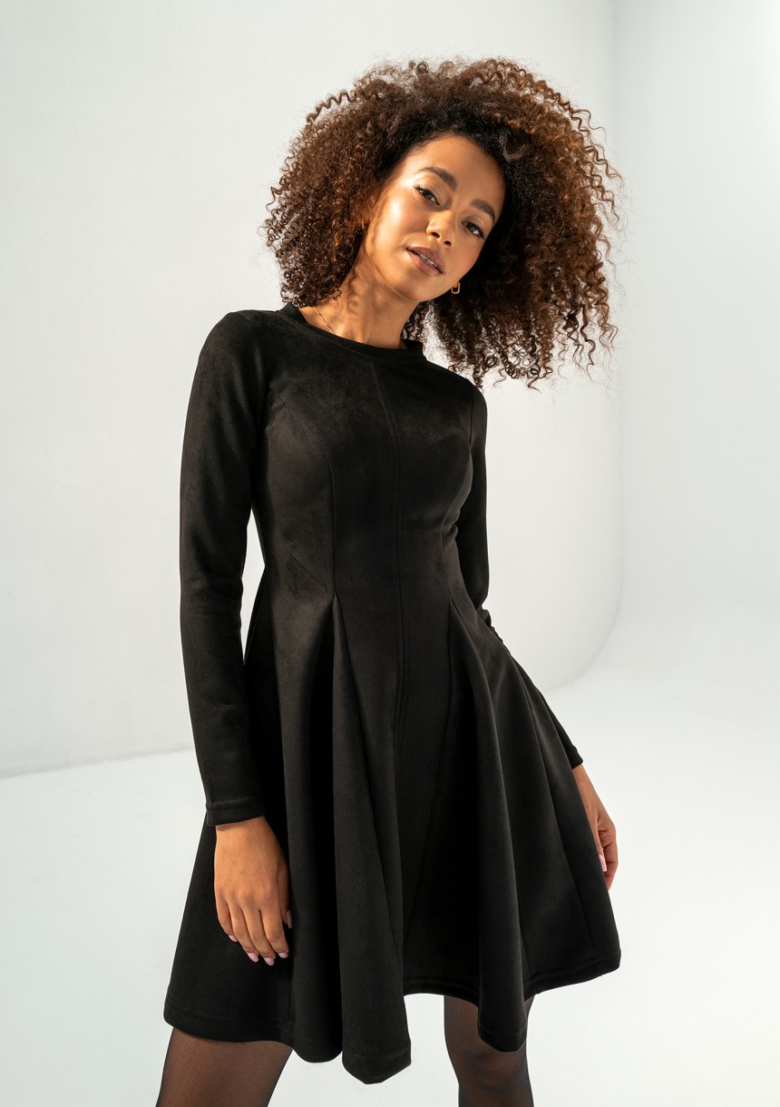 Rozkloszowana sukienka mini w czarnym kolorze, wykonana z doskonałej imitacji zamszu. Przepiękna, lekka i kobieca, idealna na codzienne spotkania i do pracy.