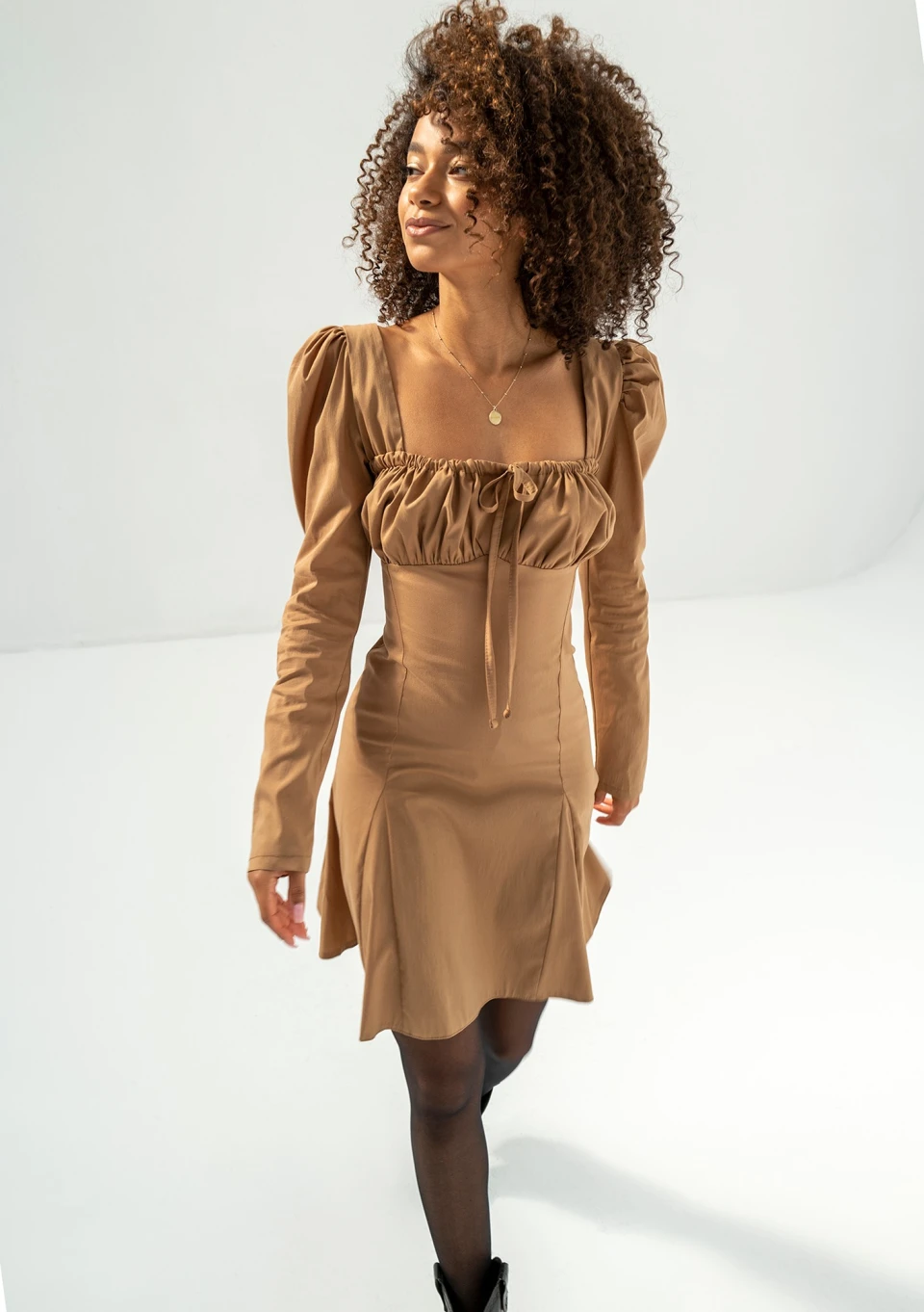 Musztardowa sukienka trapezowa o długości mini z zalotnym dekoltem z wiązaniem. Idealna na randkę, małą imprezę, spotkanie. Pełna wdzięku i subtelności!