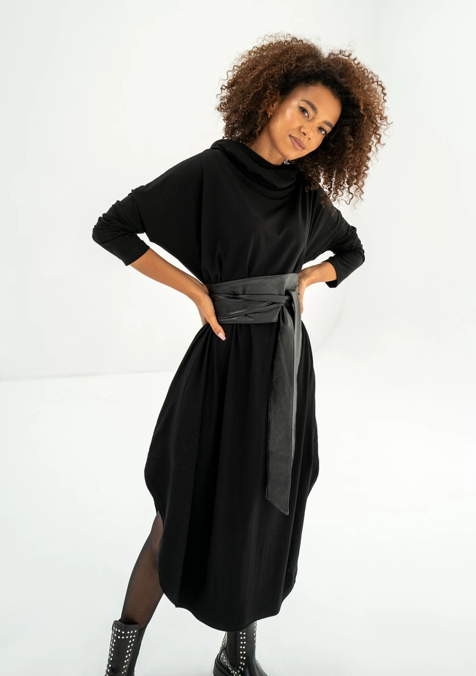 Czarna sukienka o luźnym kroju, z kieszeniami, kolistym wykończeniem i kapturem. W zestawie z długim, czarnym paskiem z imitacji skóry.