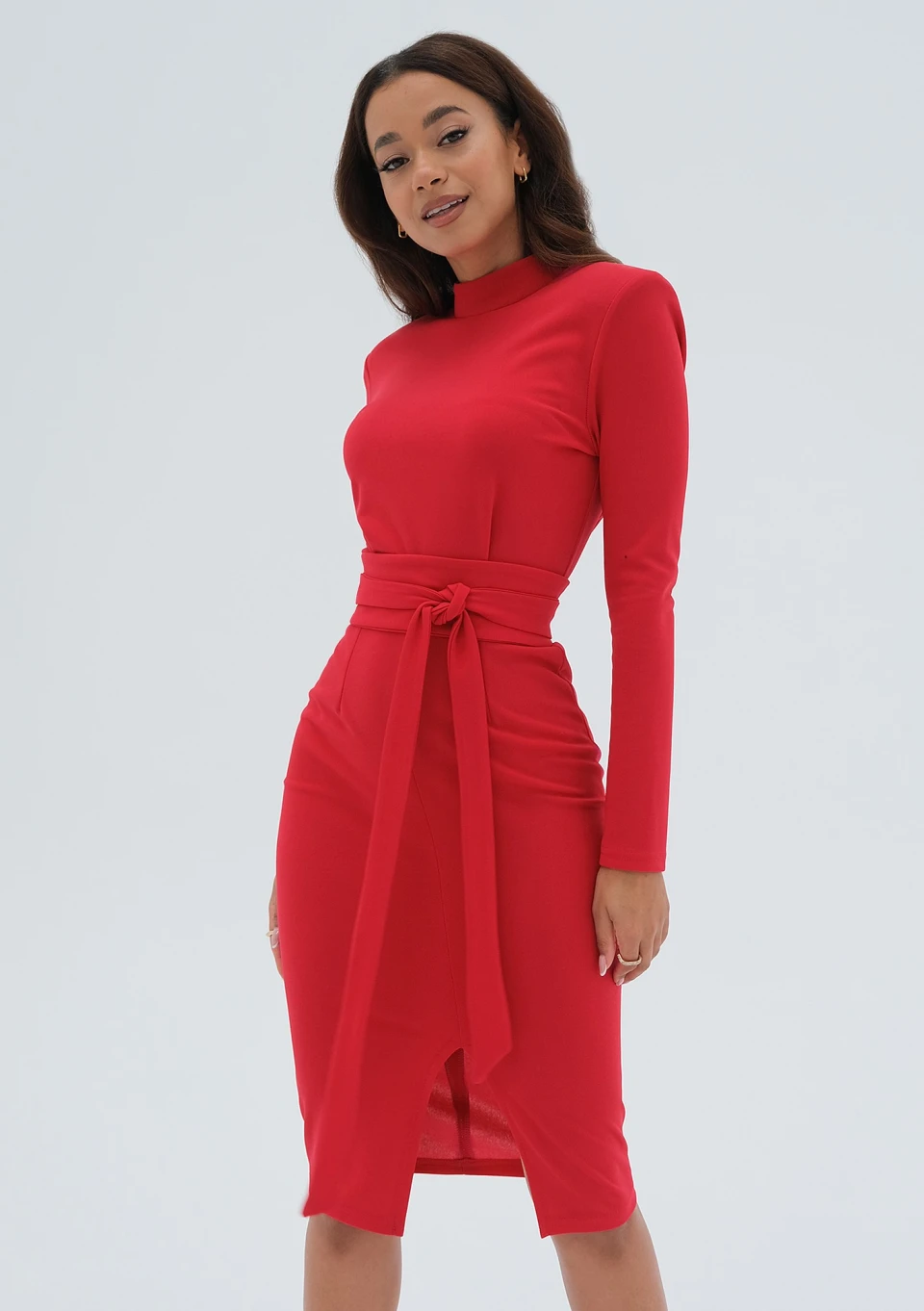 Czerwona sukienka ołówkowa midi zapewnia piękny zarys sylwetki. Dzięki poduszkom tworzy elegancki kant na ramionach. Kreacja dopełniona wiązaniem i zmysłowym rozcięciem.