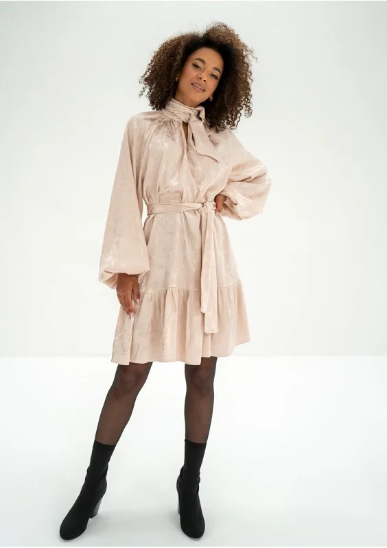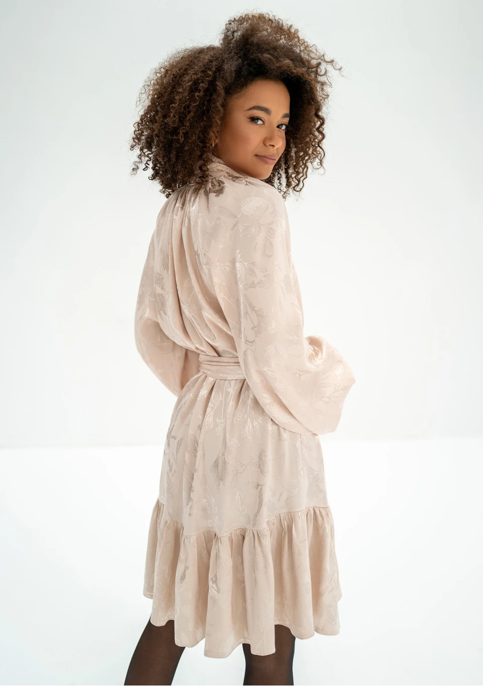 Beżowa sukienka z falbanką w eleganckim stylu, pięknie wyróżniająca się żakardowym zdobieniem faktury. Wykonana z komfortowej tkaniny wiskozowej.