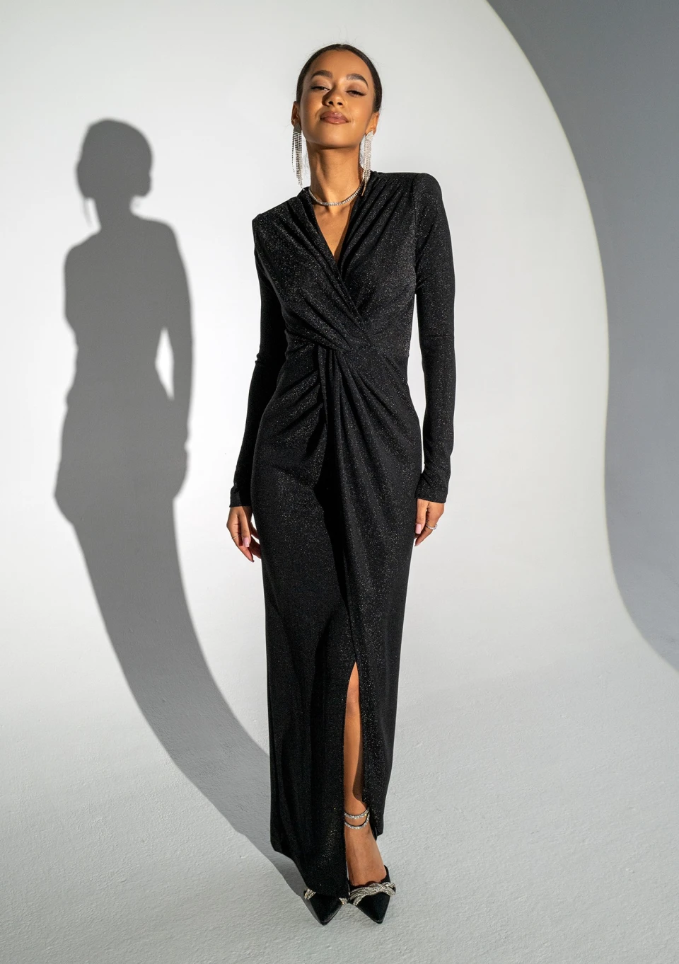 Wieczorowa sukienka maxi w stylu glamour, wykonana w eleganckiej czerni. Luksusowo błyszcząca dzięki drobinkom. Wzbogacona piękną draperią, nada sylwetce smukłości.