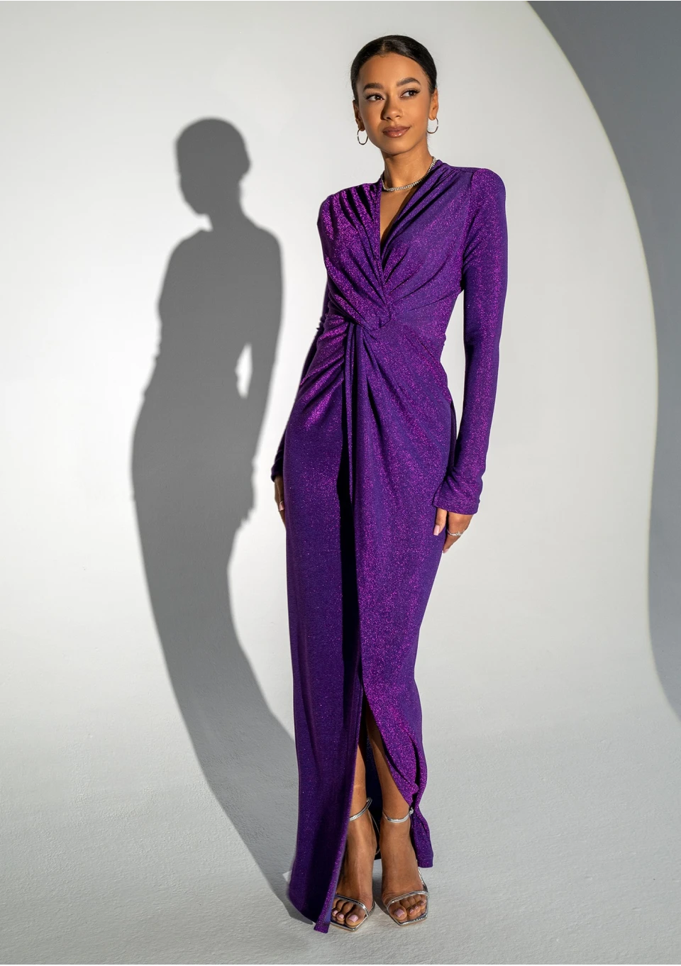 Fioletowa sukienka wieczorowa maxi dzięki eleganckiej draperii, a przede wszystkim błyszczącym drobinkom materiału zapewni Ci kapitalny look. To hipnotyzująca sukienka na sylwestra i imprezy karnawałowe, która wprawi gości w osłupienie. Rodem z czerwonego dywanu, idealna dla elegantek, które na wieczór i wyjątkowe wydarzenie pragną wystroić się w zapierającą dech, luksusową kreację. Błyszcząca sukienka z długim rękawem to także świetny wybór na wesele. Model posiada rozcięcie, dzięki któremu eksponuje nogi.
