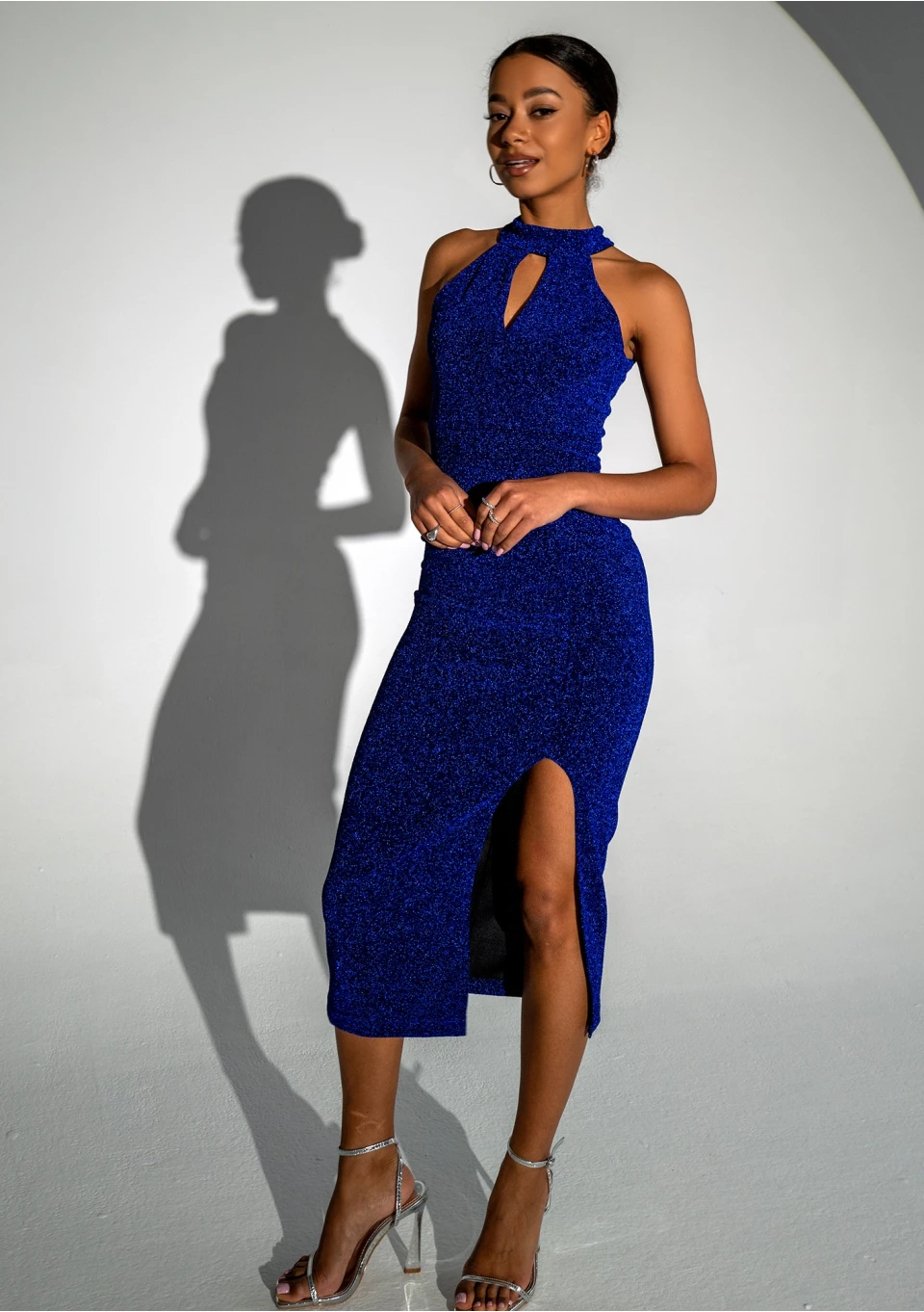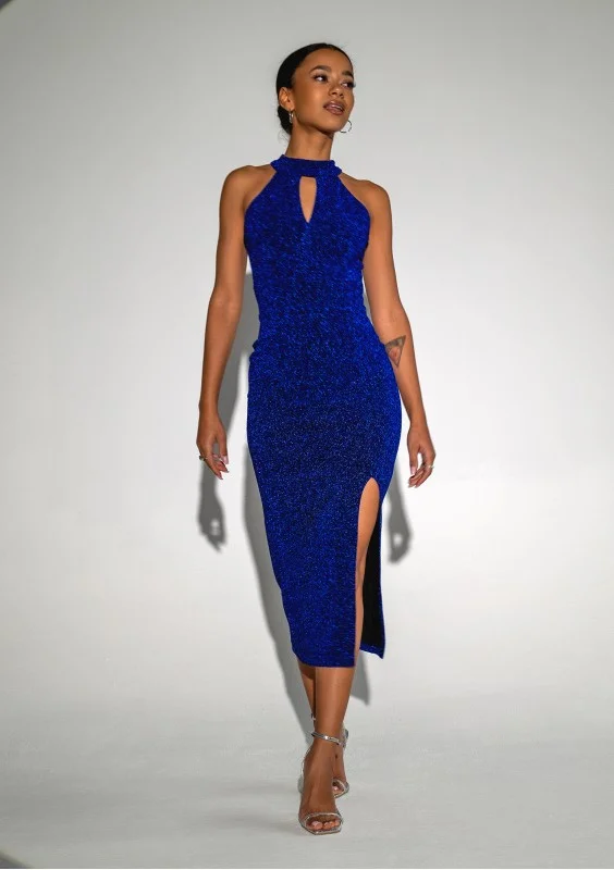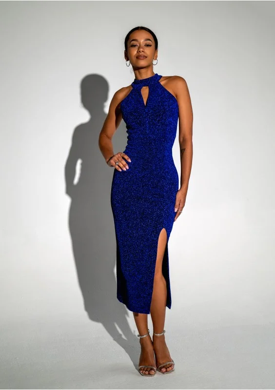Jayde - Błyszcząca sukienka midi z wycięciem Kobaltowa