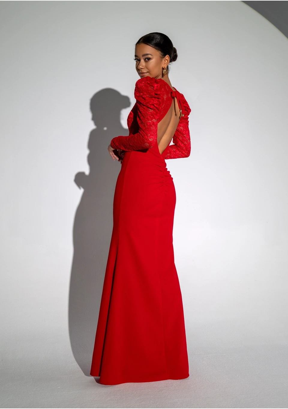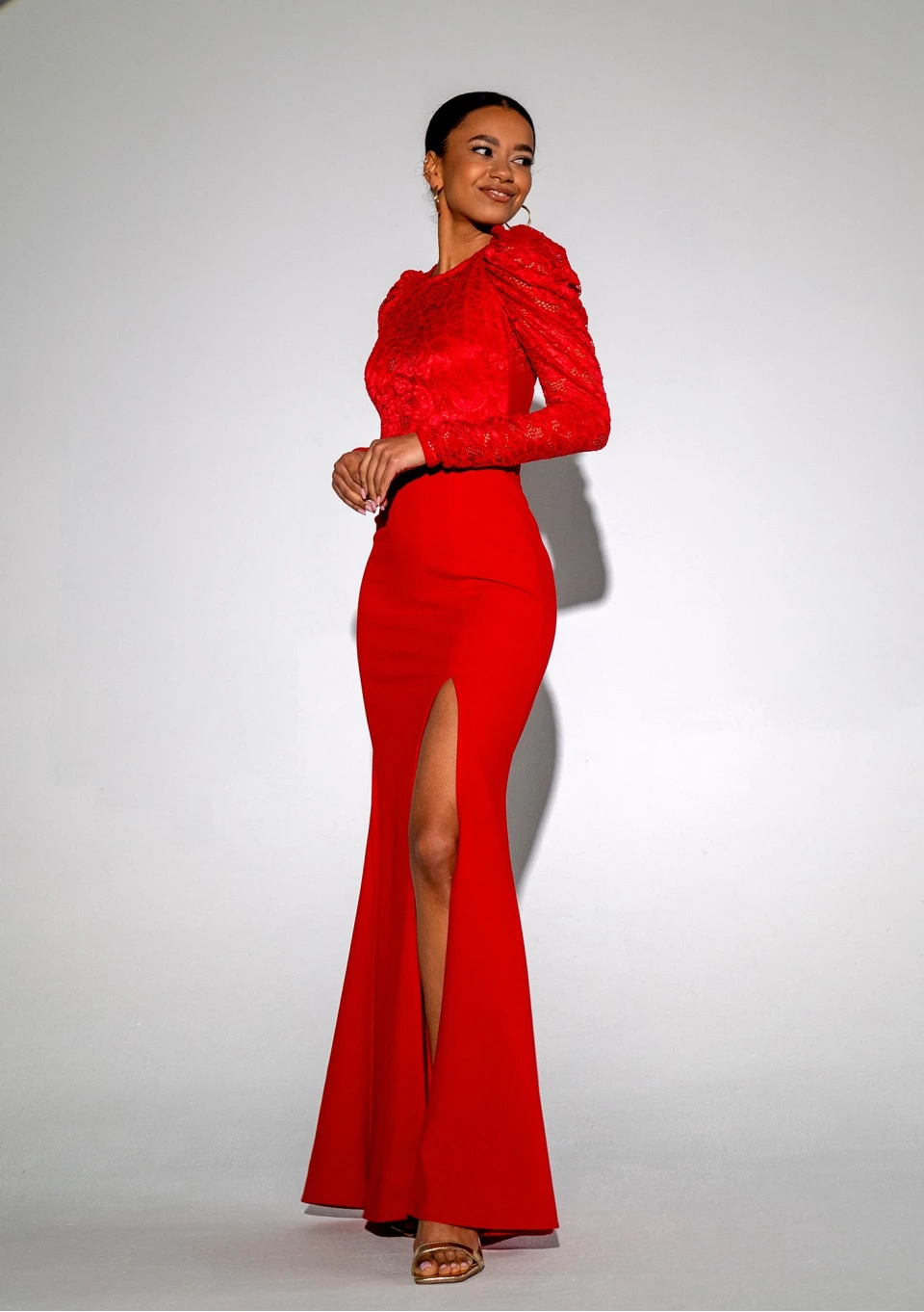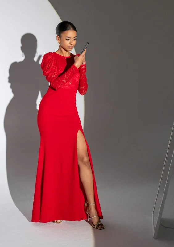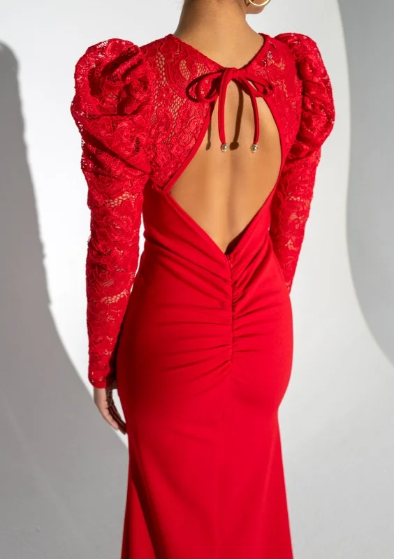 Czerwona sukienka maxi z rozporkiem. Kreacja wieczorowa z wyrafinowaną koronką i bufkami. Zniewala piękną formą syreny, uwodzi czerwienią. Eksponuje plecy.