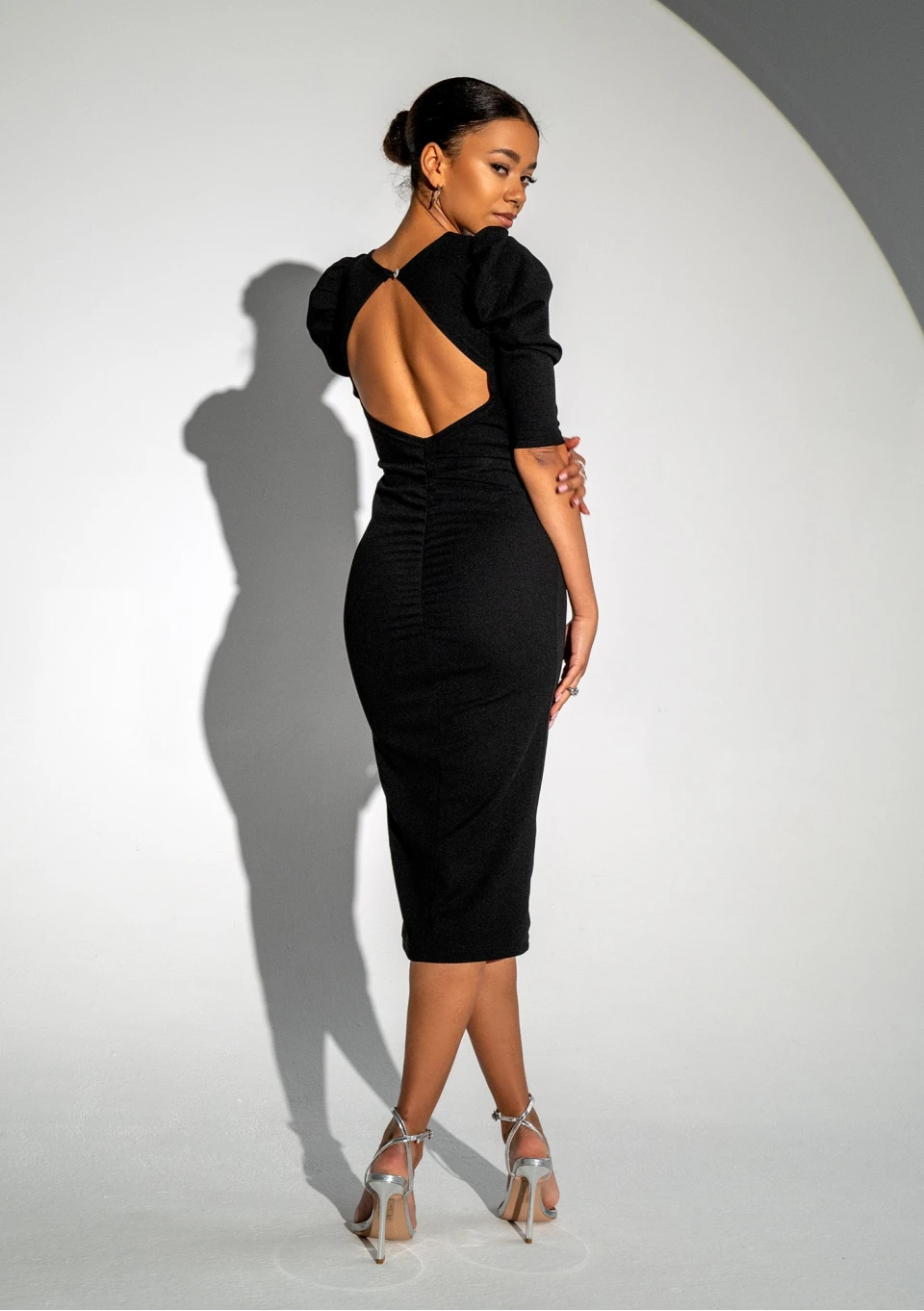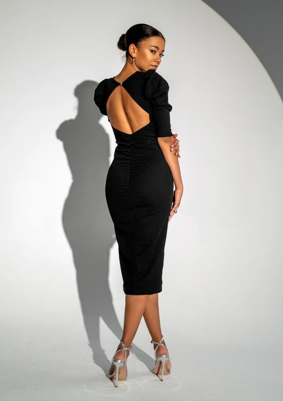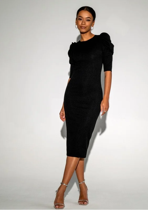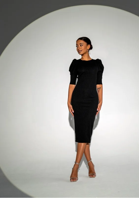 Elise - Dopasowana sukienka midi z bufkami Czarna