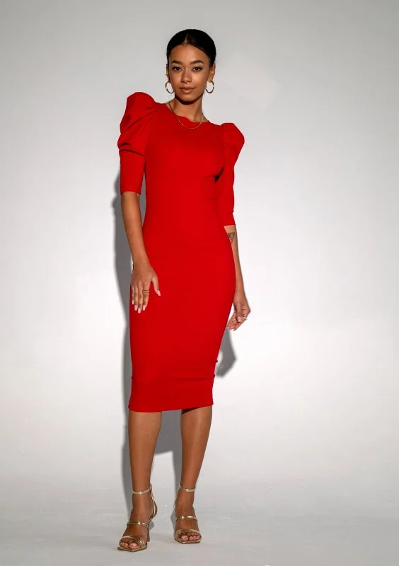 Elise - Dopasowana sukienka midi z bufkami Czerwona