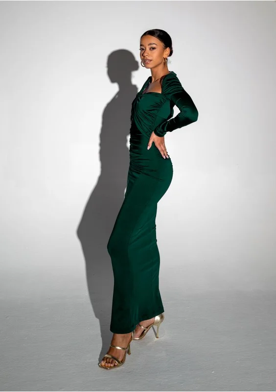 Zielona sukienka wieczorowa z intrygującą draperią dekoltu i marszczoną, dopasowaną spódnicą. Kreacja idealnie podkreśla figurę i zaskakuje rozmachem maxi.